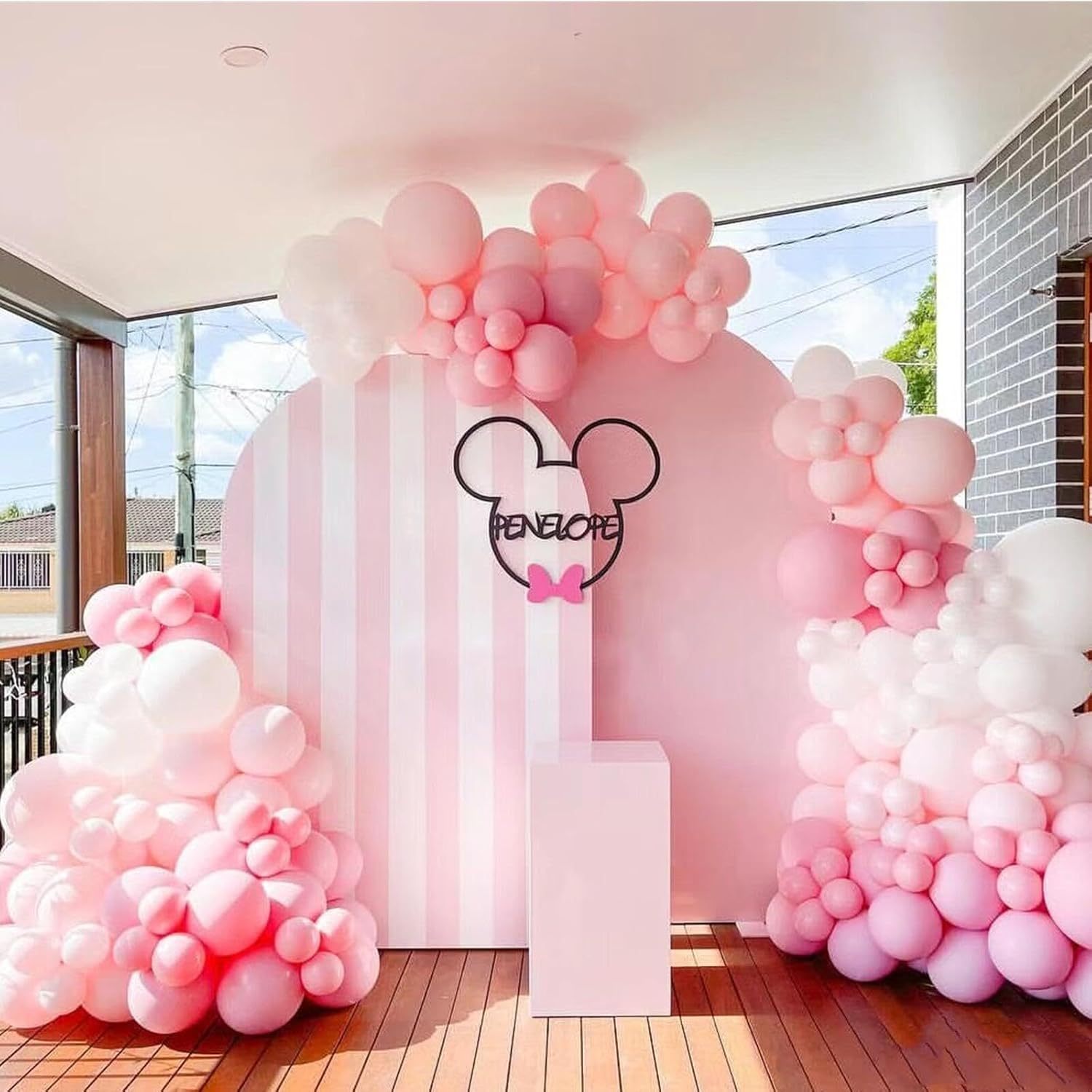 - PINK BALLOON ARCH GARLAND KIT: Includes 412 pastel pink Balloons, 18inch 12pcs, 12inch 100pcs, 10inch 100pcs, 5inch 200pcs , 2 rolls of Balloon glue point(200pcs), 2 rolls of balloon decoration strip(32.8 feet / 5m*2 with 220 holes), 2 roll of ribbon. plenty in quantity, perfect for making indoor or outdoor them decoration.