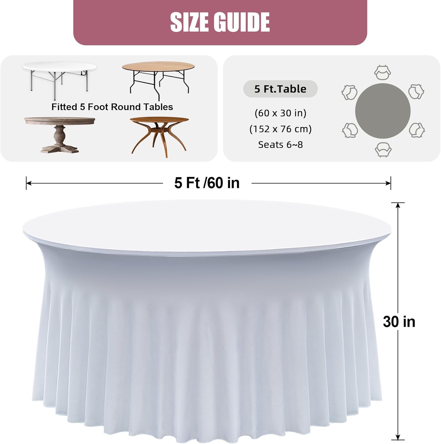 - 【Package and Size】 - Your Package will come with 2 pack white round spandex tablecloth,the size of each tablecloth is 60 inches in diameter and 30inch in height,to the flooor, tighy fit 5ft round party tables.