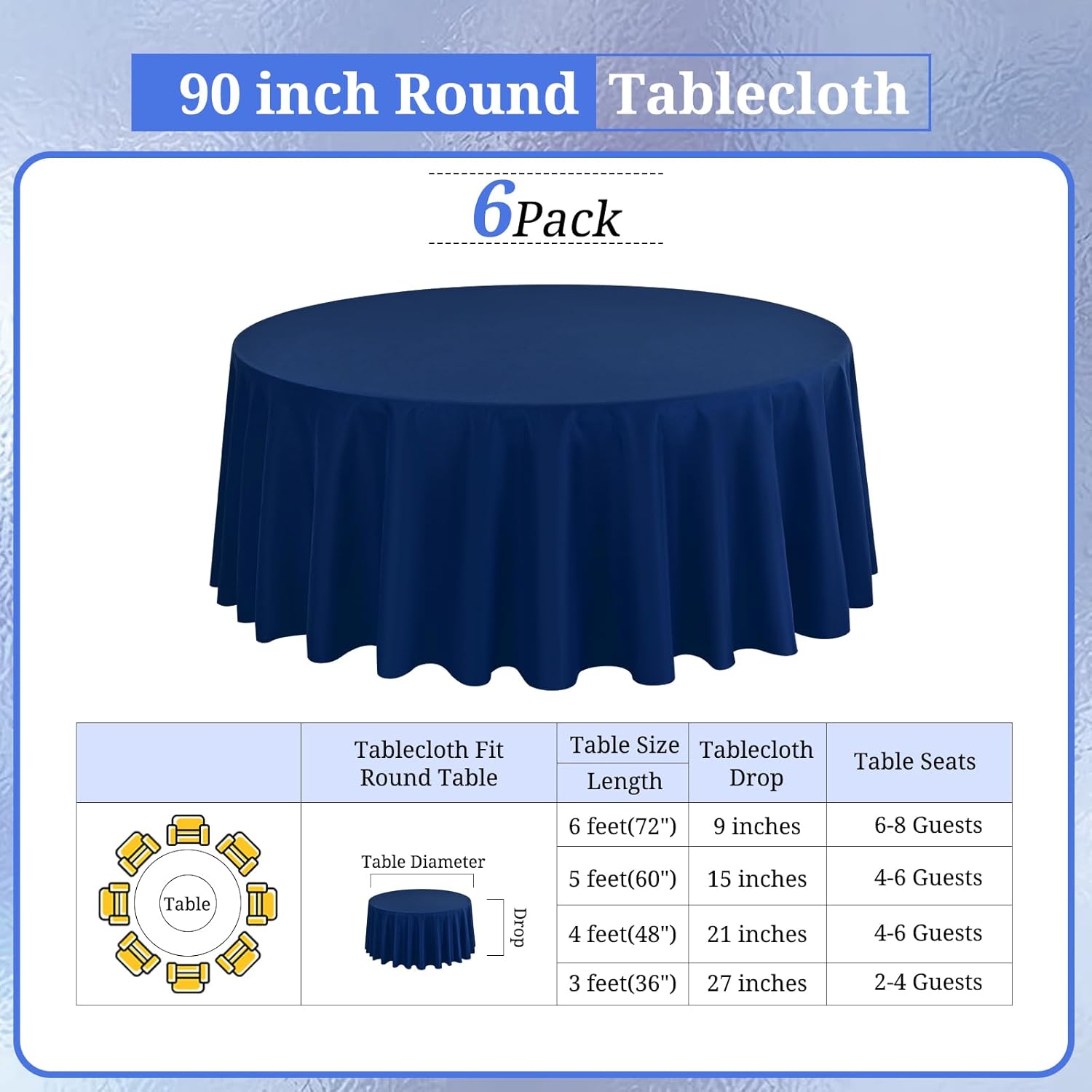 - 【Superior Tablecloth Material】: You will get 6 pack navy blue round tablecloth, this durable and easy to clean tablecloth is made from180 GSM 100% premium polyester fabric that resists wrinkling for an always crisp, polished look. Providing more convenience for your using and cleaning. Durable for repeat use.
