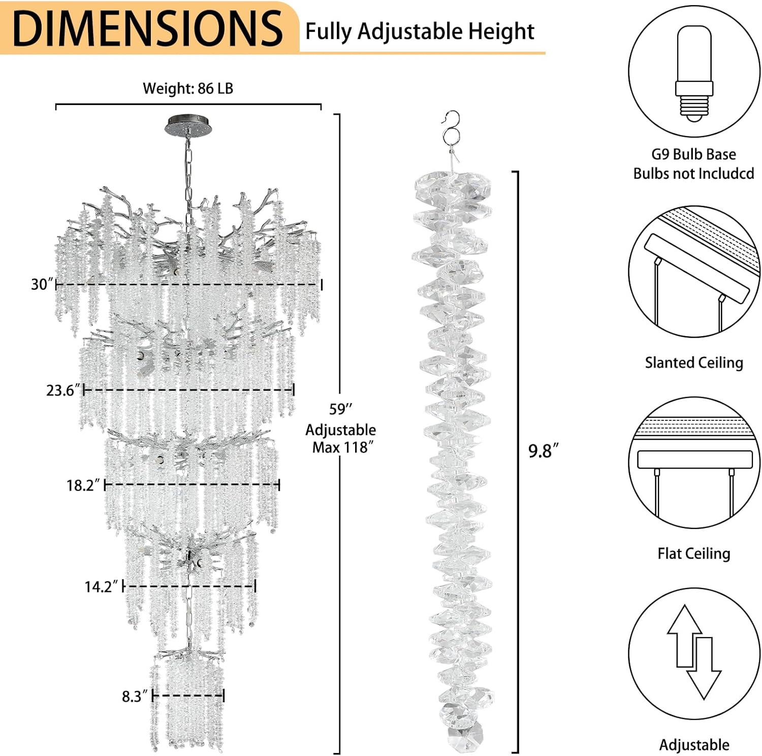 - 【Staircase Chandeliers Dimensions】Overall:30" x 30" x 63" (L x W x H),and the chandelier cable can be adjusted up to 118 inches.The pendant light frame is constructed from aluminum alloy and copper,with each branch being detachable for easy assembly. Simply hang the crystals on the branches. Assembly may take some time, but it will meet your expectations