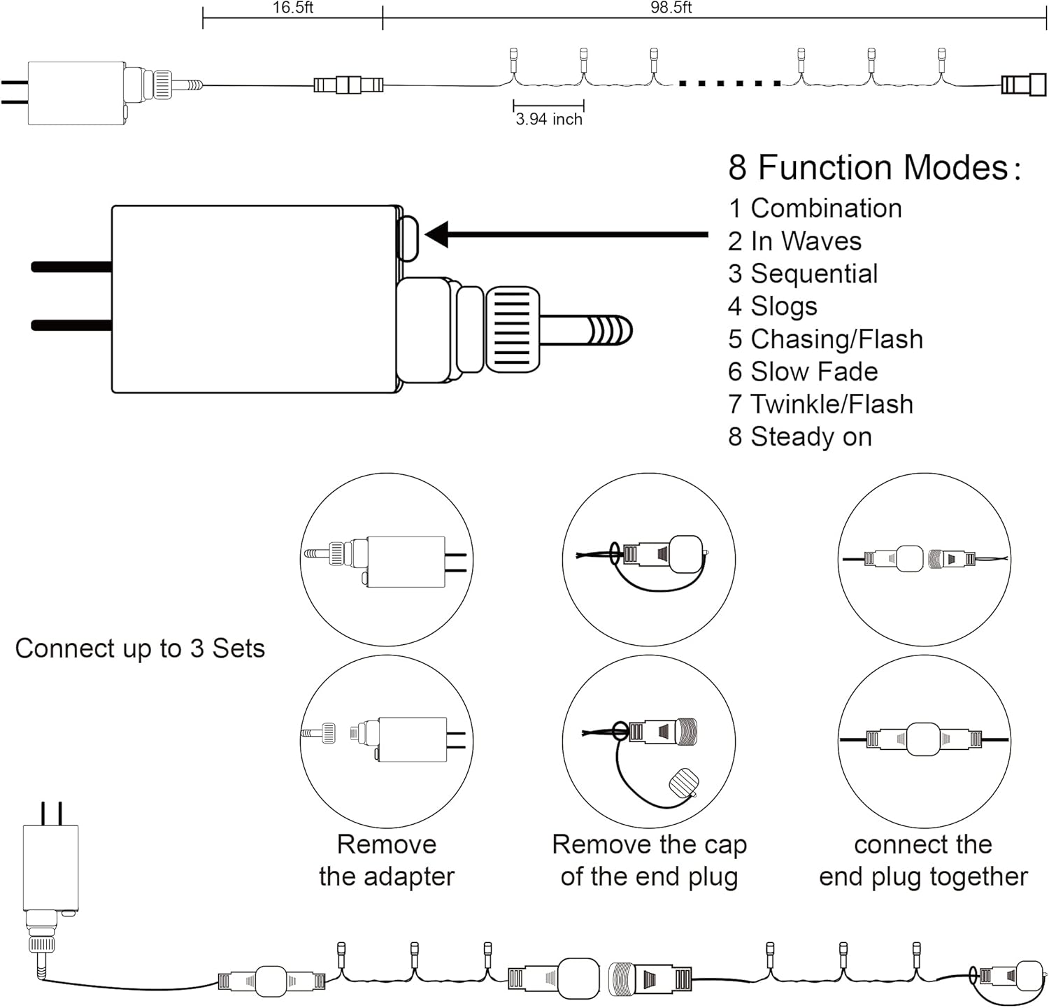 - Functions: 8 lighting modes including combination, sequential, chasing, slow fade, twinkle, steady, and memory function for customizable lighting.