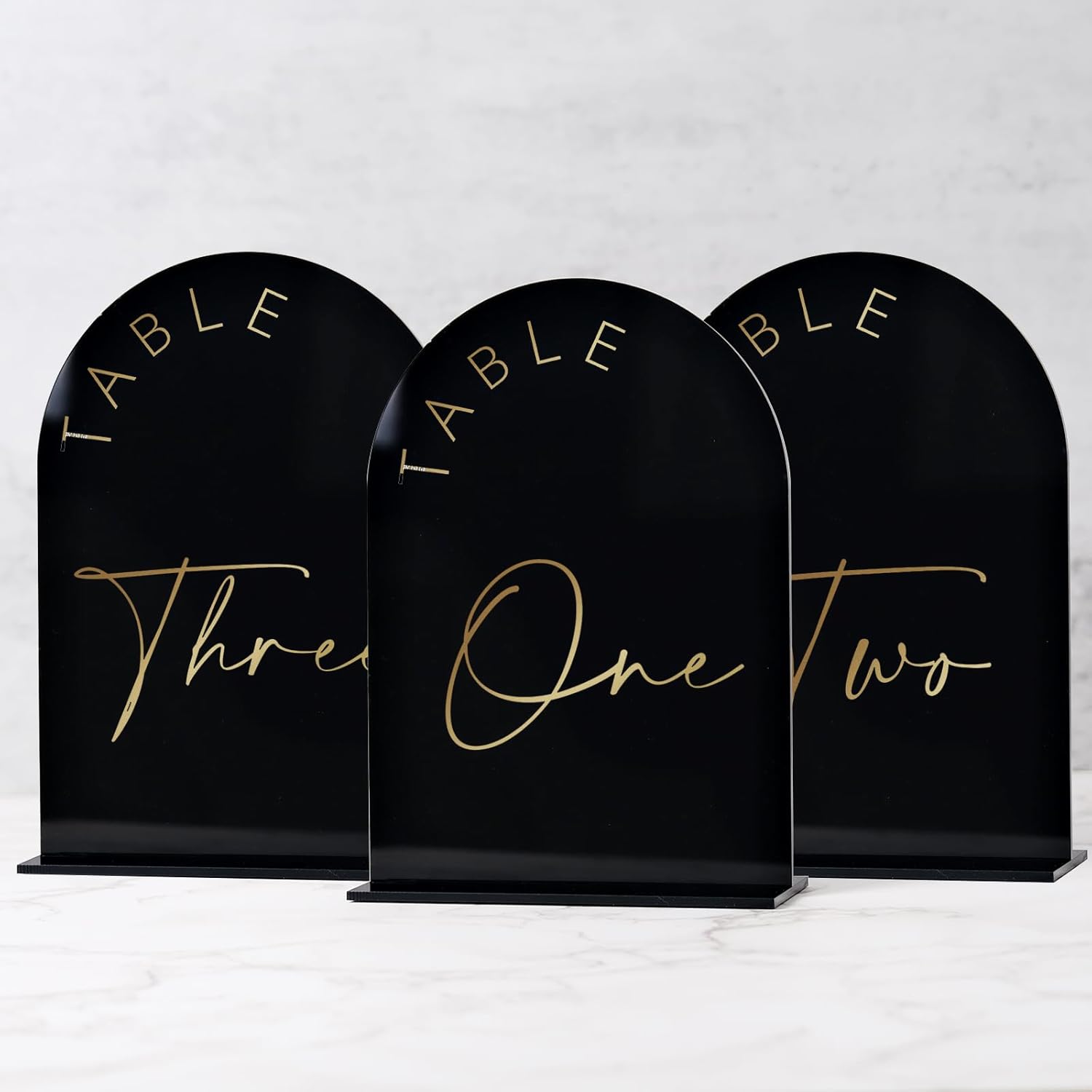 - PREMIUM QUALITY: These arch table numbers black and gold with stands are made from high quality black acrylic panels and then printed with gold letters in a simple arch design that won't go out of style and will last a long time.