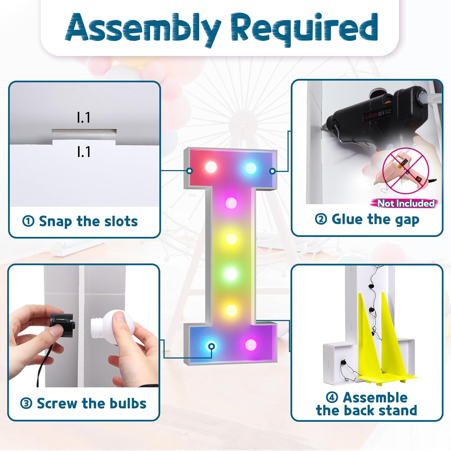 - Assembly Required. To assemble the light up numbers and letters, a hot glue gun is necessary. We have conveniently pre-cut the numbers into several pieces for your convenience. Simply consult the included instruction manual to easily assemble the impressive 4 ft tall and 3ft tall marquee numbers and letters using a hot glue gun.