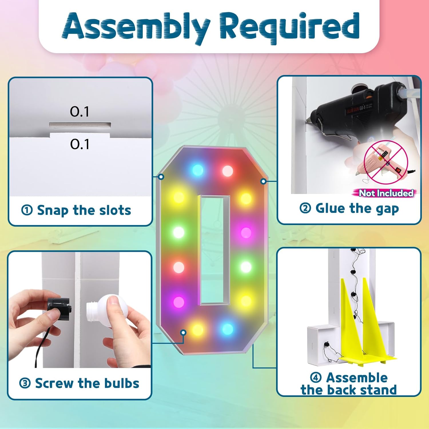 - Assembly Required. To assemble the light up numbers and letters, a hot glue gun is necessary. We have conveniently pre-cut the numbers into several pieces for your convenience. Simply consult the included instruction manual to easily assemble the impressive 4 ft tall and 3ft tall marquee numbers and letters using a hot glue gun.