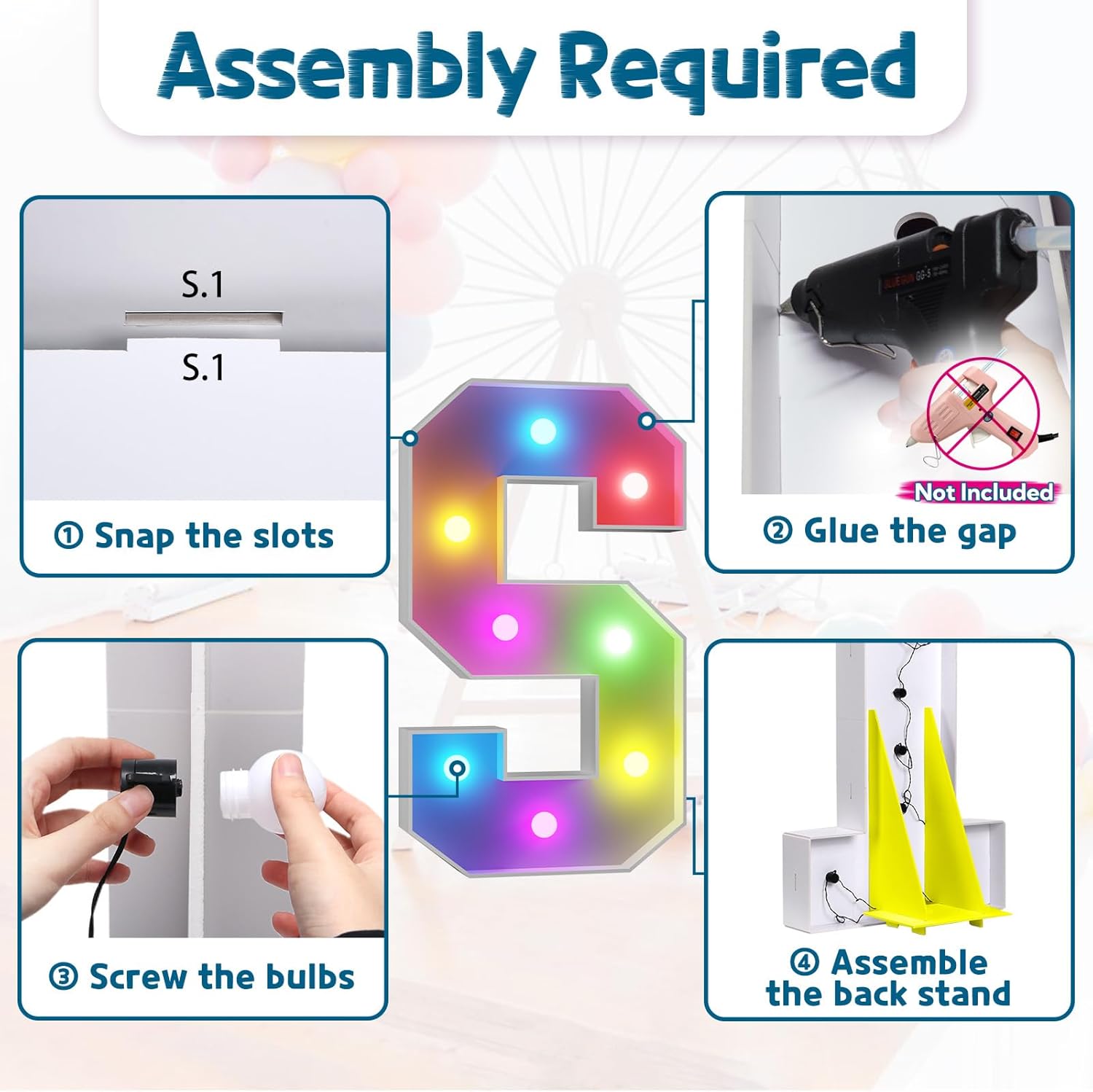 - Assembly Required. To assemble the light up numbers and letters, a hot glue gun is necessary. We have conveniently pre-cut the numbers into several pieces for your convenience. Simply consult the included instruction manual to easily assemble the impressive 4 ft tall and 3ft tall marquee numbers and letters using a hot glue gun.