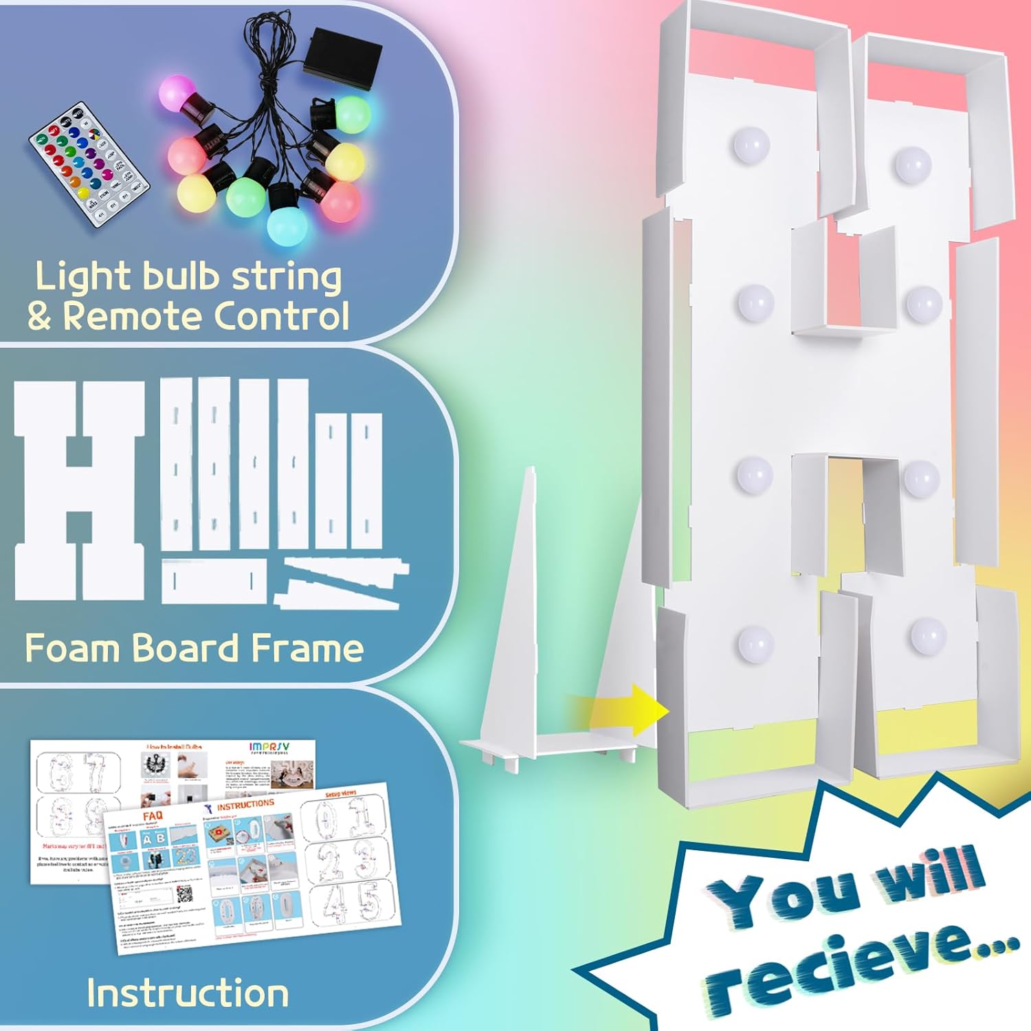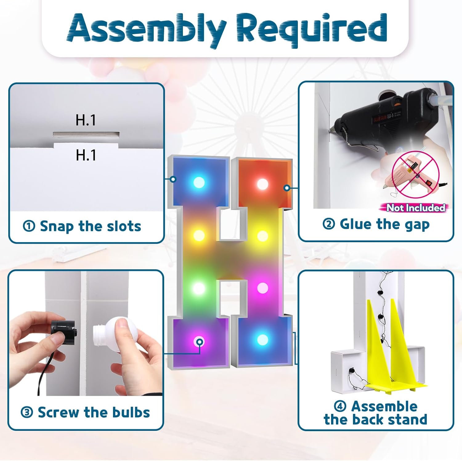- Assembly Required. To assemble the light up numbers and letters, a hot glue gun is necessary. We have conveniently pre-cut the numbers into several pieces for your convenience. Simply consult the included instruction manual to easily assemble the impressive 4 ft tall and 3ft tall marquee numbers and letters using a hot glue gun.