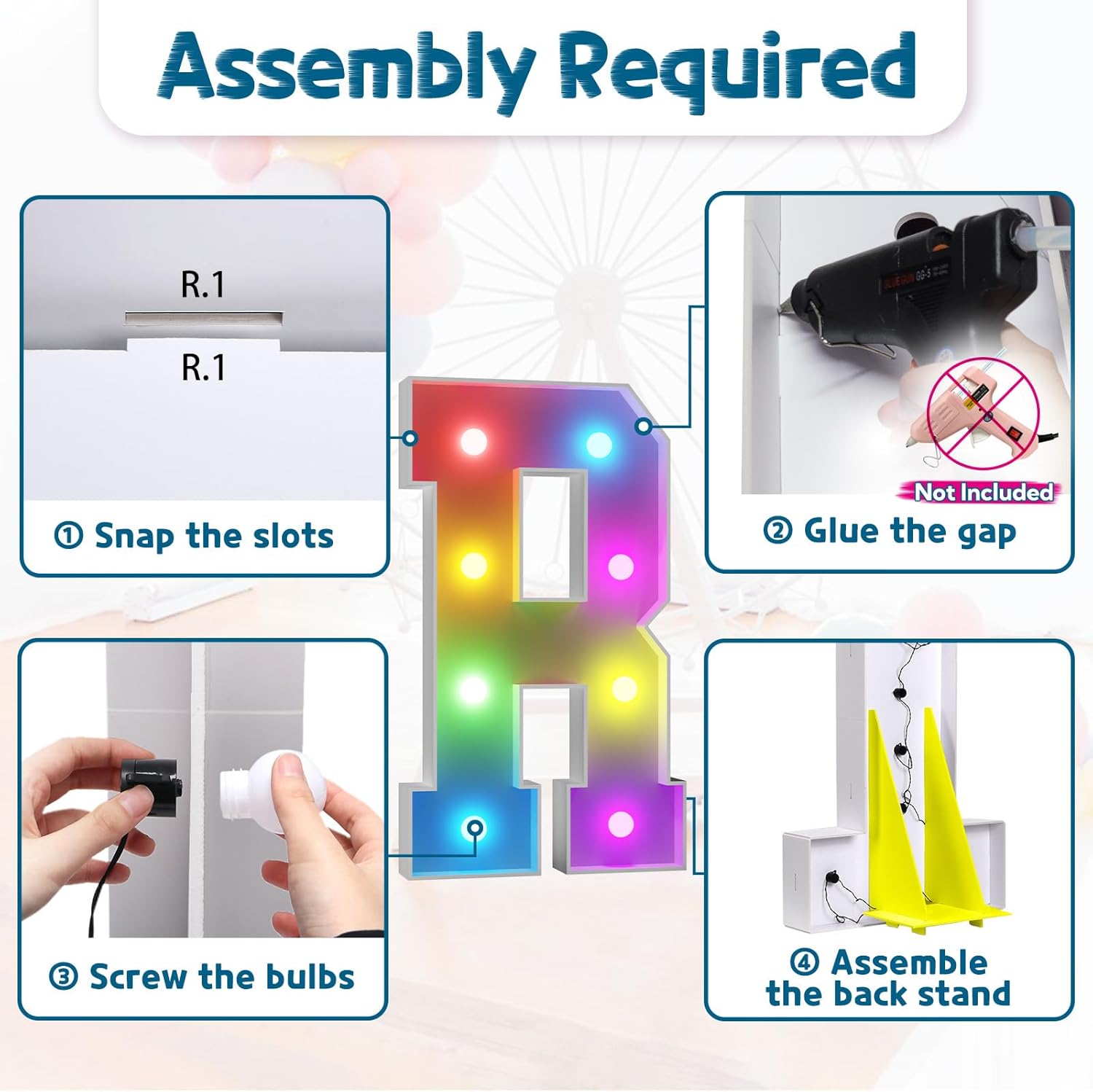 - Assembly Required. To assemble the light up numbers and letters, a hot glue gun is necessary. We have conveniently pre-cut the numbers into several pieces for your convenience. Simply consult the included instruction manual to easily assemble the impressive 4 ft tall and 3ft tall marquee numbers and letters using a hot glue gun.