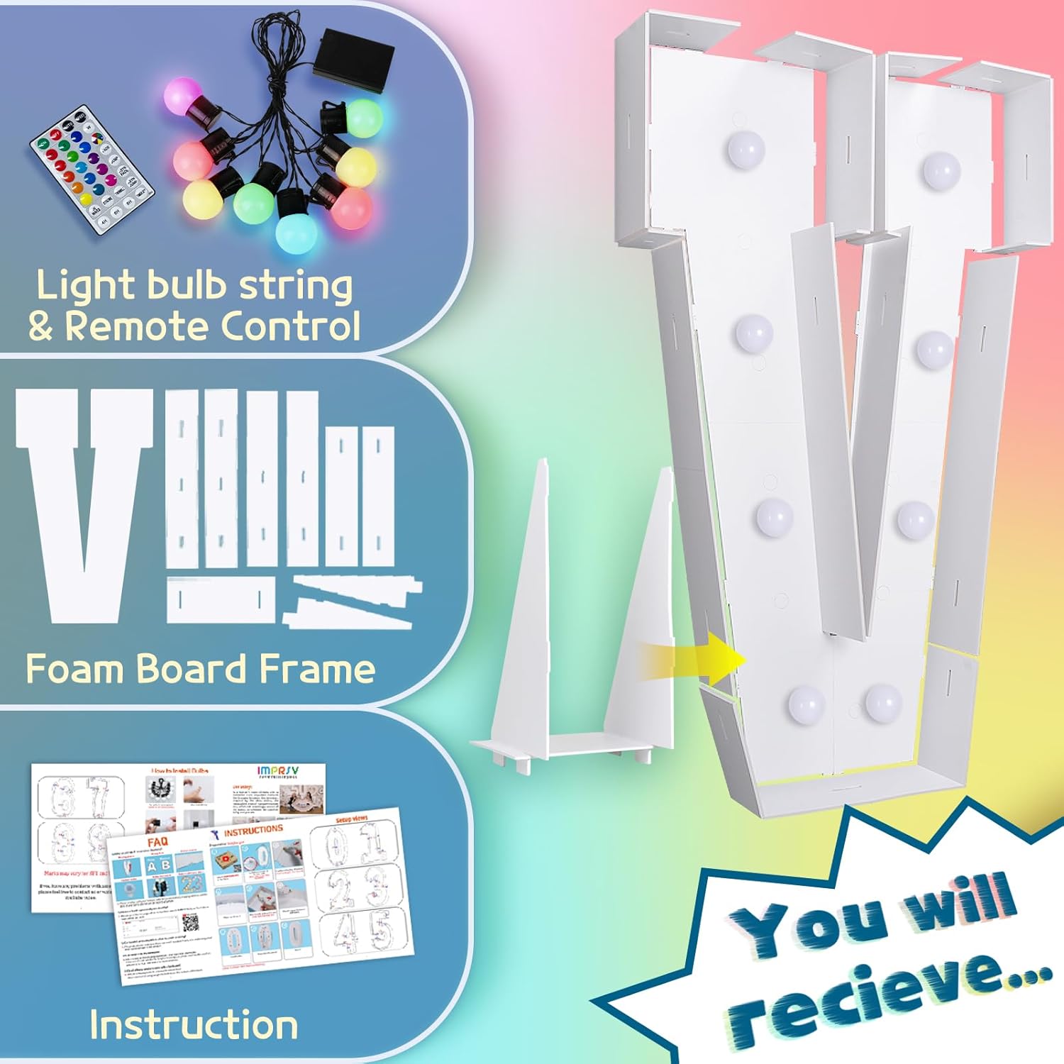 imprsv 3FT Colorful Marquee Light Up Letters V, 18 Colors Light Up Sign Alphabet Sign with Remote, One Letters First Birthday, Large Letters for Birthday Engagement Anniversary Wedding Party Decor