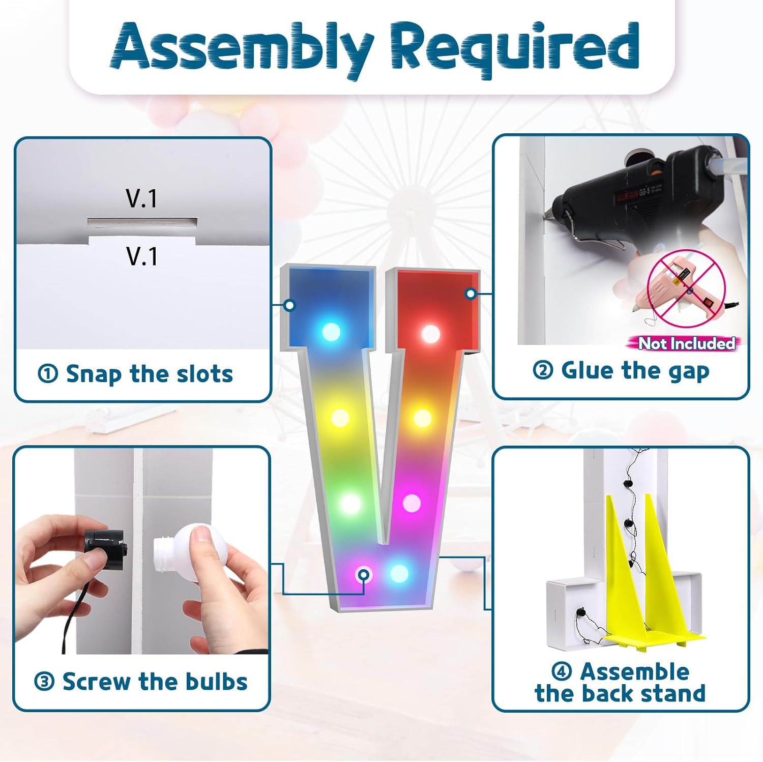 - Assembly Required. To assemble the light up numbers and letters, a hot glue gun is necessary. We have conveniently pre-cut the numbers into several pieces for your convenience. Simply consult the included instruction manual to easily assemble the impressive 4 ft tall and 3ft tall marquee numbers and letters using a hot glue gun.
