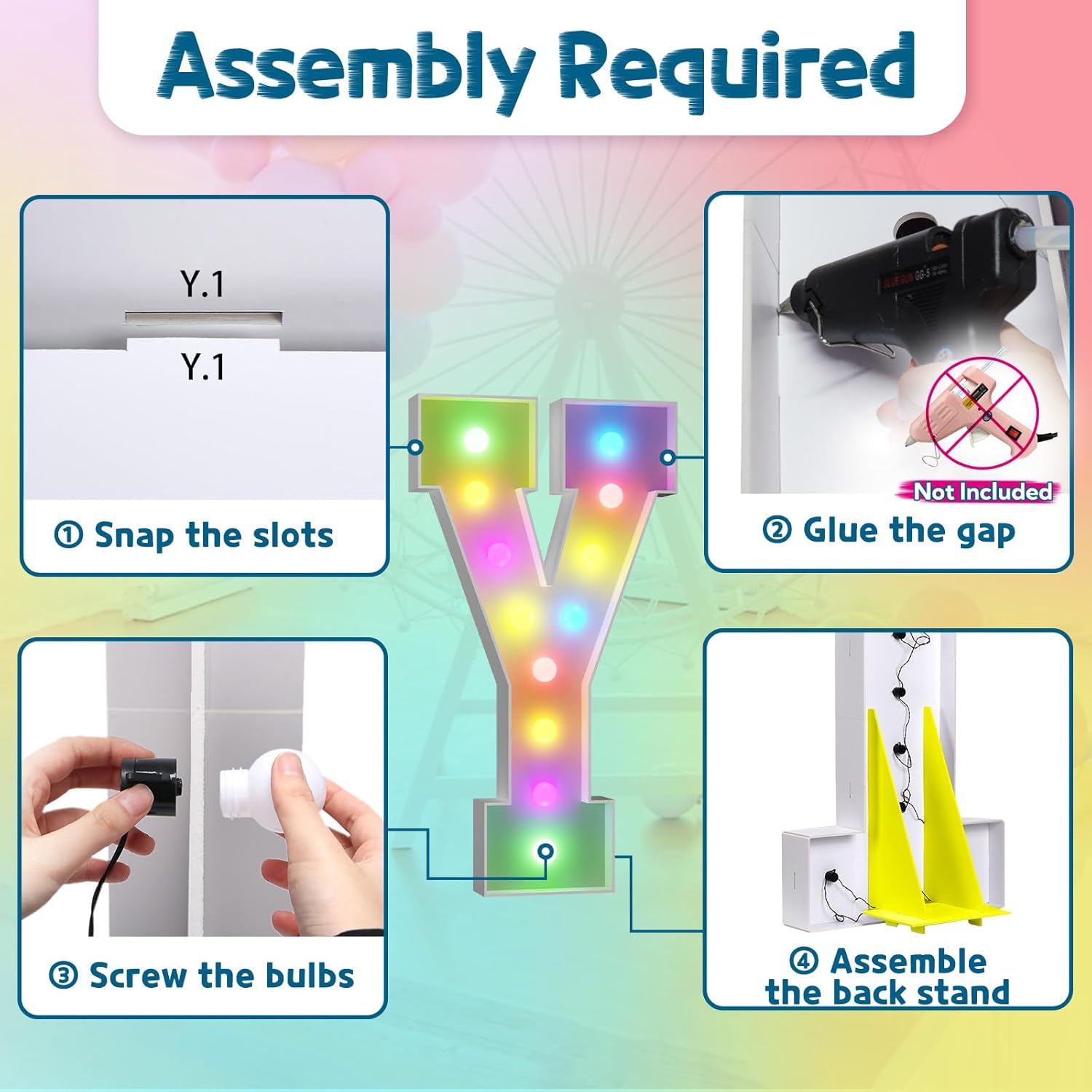 - Assembly Required. To assemble the light up numbers and letters, a hot glue gun is necessary. We have conveniently pre-cut the numbers into several pieces for your convenience. Simply consult the included instruction manual to easily assemble the impressive 4 ft tall and 3ft tall marquee numbers and letters using a hot glue gun.