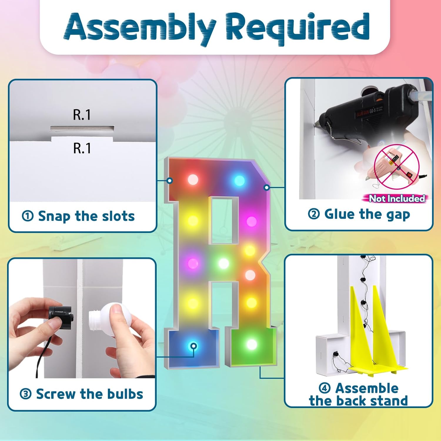 - Assembly Required. To assemble the light up numbers and letters, a hot glue gun is necessary. We have conveniently pre-cut the numbers into several pieces for your convenience. Simply consult the included instruction manual to easily assemble the impressive 4 ft tall and 3ft tall marquee numbers and letters using a hot glue gun.
