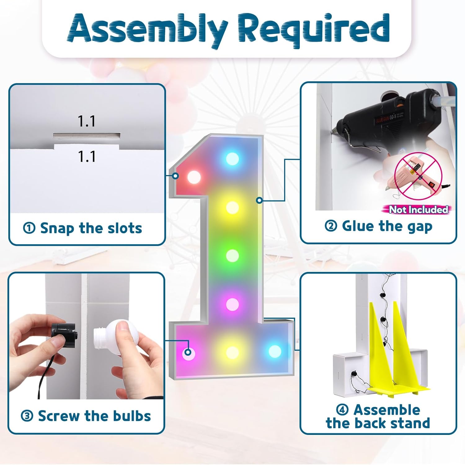 - Assembly Required. To assemble the light up numbers and letters, a hot glue gun is necessary. We have conveniently pre-cut the numbers into several pieces for your convenience. Simply consult the included instruction manual to easily assemble the impressive 4 ft tall and 3ft tall marquee numbers and letters using a hot glue gun.