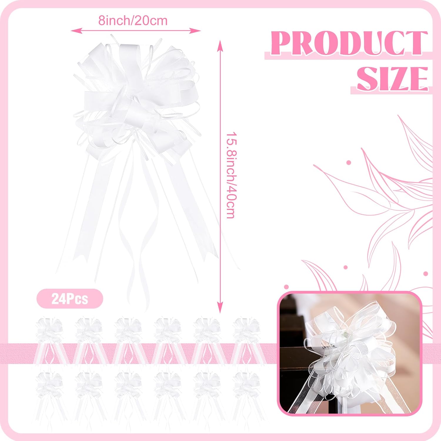 - Suitable Size for Variety: you will get 24 white bows; Our white pull bows have a flexible size that fits various applications; Before pulling, these bows measure up to about 2.6 inches wide and 74.8 inches long; After pulling, they transform into a pretty flower measuring around 8 x 15.8 inches, making them adorable
