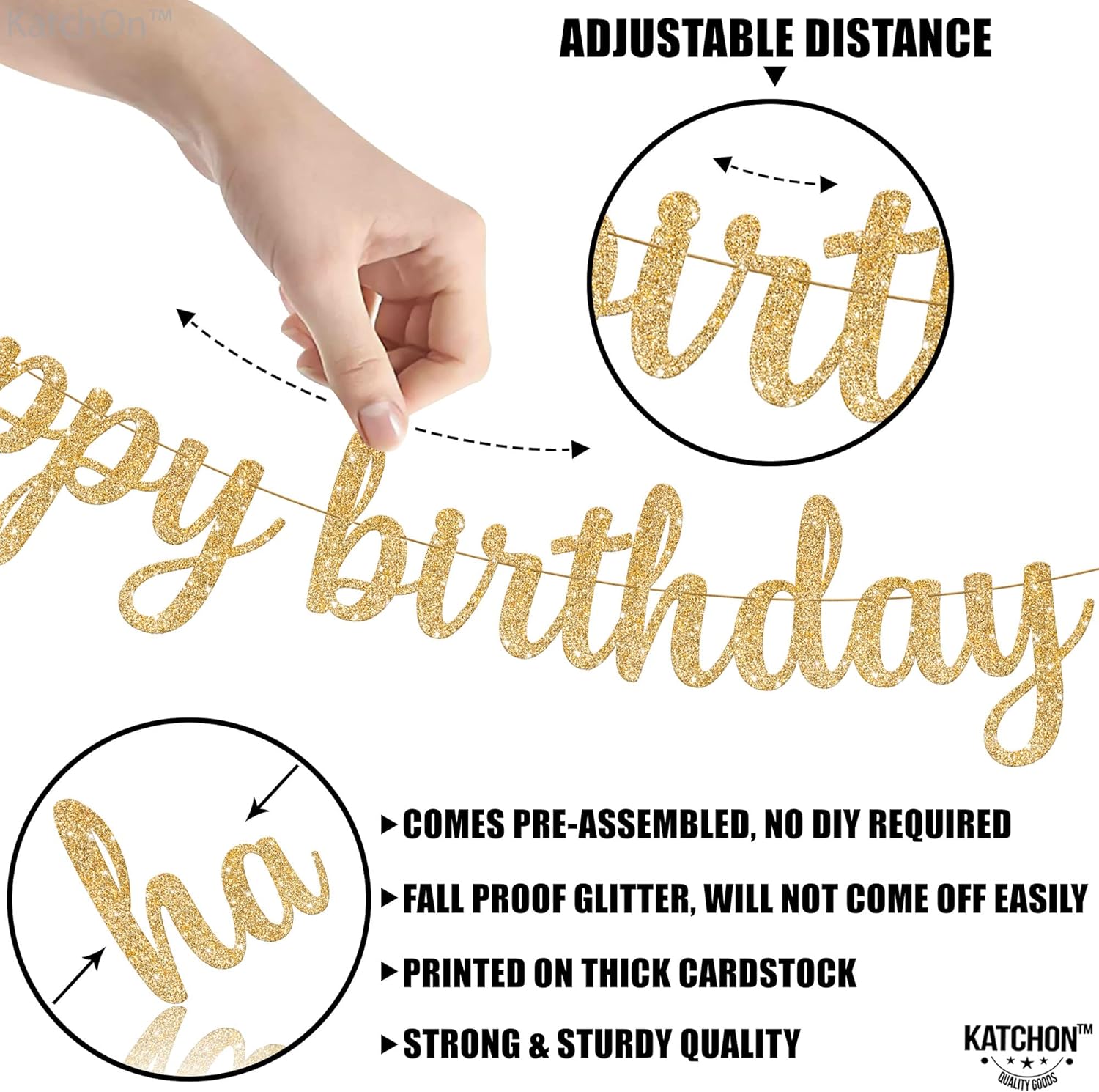 KatchOn, Glitter Cursive Gold Happy Birthday Banner - Pre-Strung, 10 Feet | Birthday Decorations for Women, Men, Boys and Girls | Hbd Banner Backdrop For Birthday Party Decorations | Gold Happy Birthday Sign