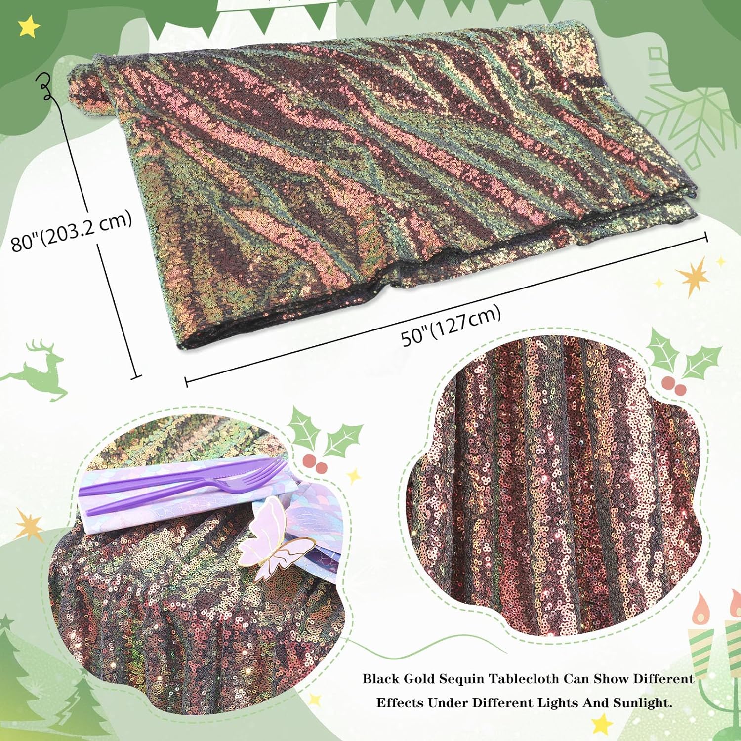 - Black and Gold Sequin Tablecloth Size:1 packs of Black and Gold sequin tablecloth, the size of the Black and Gold tablecloth is 50 W by 80 L inch. It's long enough to fit any round, rectangle or square table.