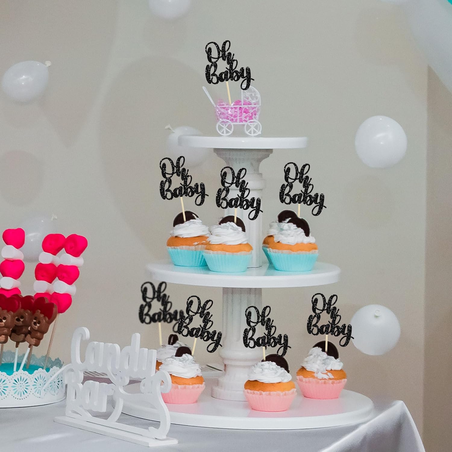 Gyufise 36Pcs Oh Baby Cupcake Toppers Glitter Baby Shower Cupcake Picks Oh Baby Cake Decorations for Gender Reveal Baby Shower Kids Boys Girls Birthday Party Supplies Black