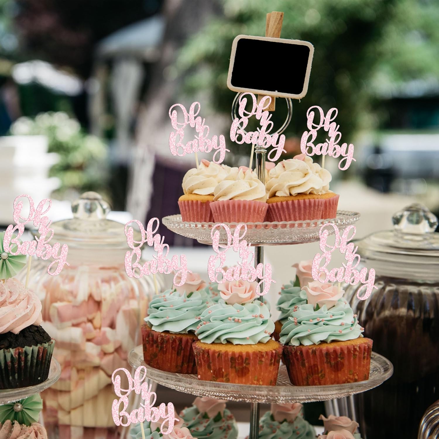 Gyufise 36Pcs Oh Baby Cupcake Toppers Glitter Baby Shower Cupcake Picks for Gender Reveal Baby Shower Kids Boys Girls Birthday Party Cake Decorations Supplies Light Pink