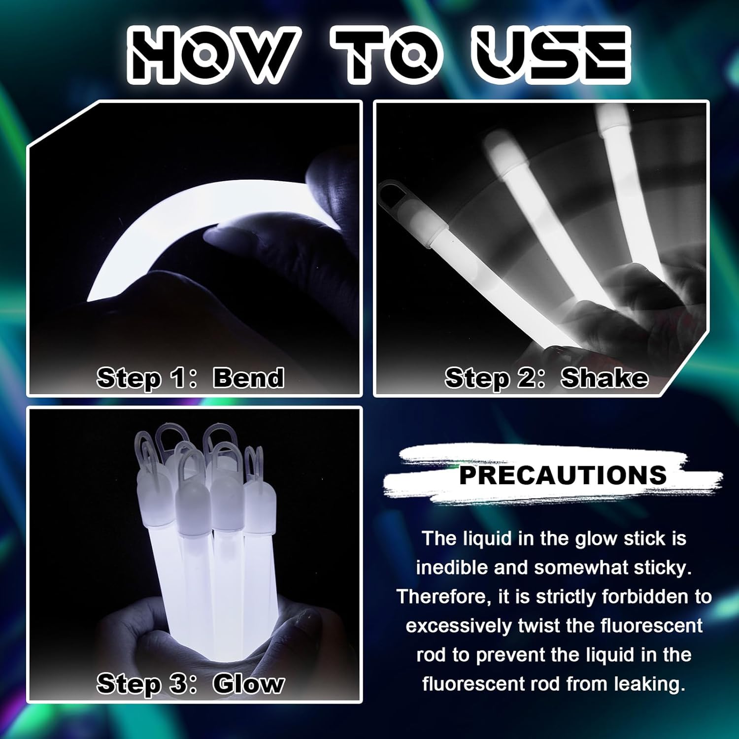 • Please Note: the liquid in the bulk glow sticks is not edible and has an adhesion; If it leaks, it is easy to pollute furniture, floors, clothing, skin, etc.; If the above situation occurs, be sure to clean it in time; If the fluid from the glow stick gets into your eyes, rinse with water or seek medical attention