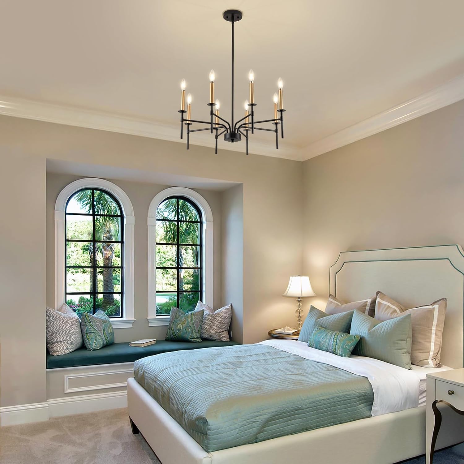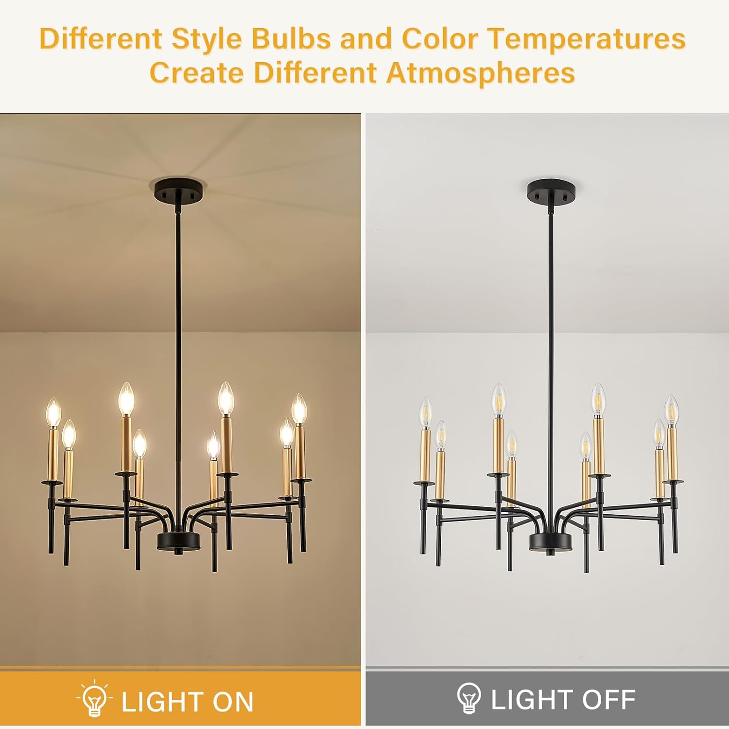 - Adaptable E12 Bulbs & Dimmers: The gold black farmhouse chandelier uses 8 golden candelabra shaped E12 bulbs (max 60W/bulb), which are compatible with LED, incandescent, halogen and other types of bulbs, and can be matched with dimmers (bulbs and dimmers are NOT included). You can match different shapes and color temperatures of bulbs to create the appropriate atmosphere according to different activities, such as friend party, family dinner, chatting in the living room, watching movies in the bedroom, entry and staircase decorations and so on