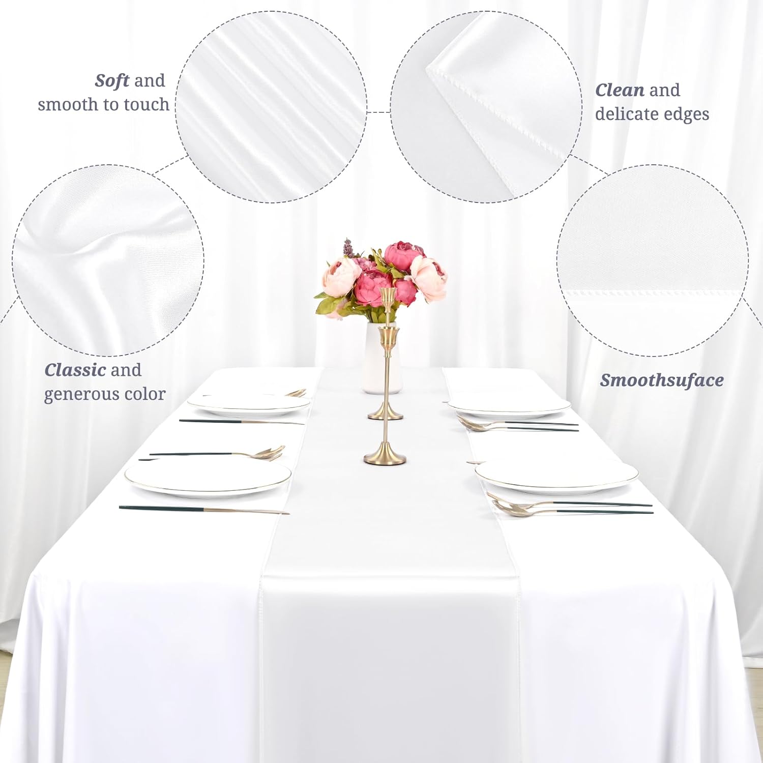 - 🍷【Set includes】12 Pack white satin table runner measures 12" x 108" in size, appropriate for a table that can seat 8-10 people. This satin table runner can fit a 6ft/8ft rectangular table or round table well.This satin table runner is great for event table decorations.Our satin table runner make your dining table more dazzling and outstanding.Purchase our 12piece satin table runner and save even more.