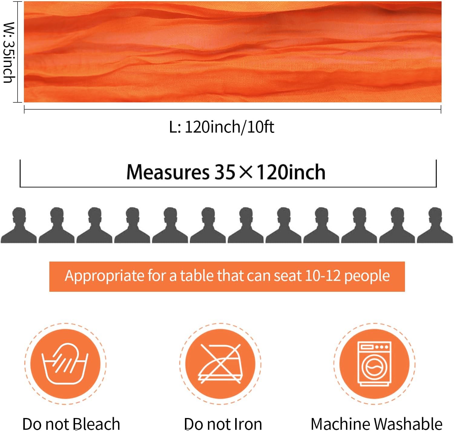 - 🍊【Long Centerpieces for Table】The size of each table runner is approximately 35 x 120 inches / 90 x 300 cm, which is large enough to cover rectangle and round tables, can also be spliced together for long tables. A simple and easy way to dress up a table as wrinkled design no ironing is required & they add a soft touch to your decor! The orange gauze table runner can be compressed, lightweight, and compact, easy to store, more space-saving. You won’t want to miss out on adding this wedding table runner to your dining space. With it every party will bring you giving you romantic and elegant memories.