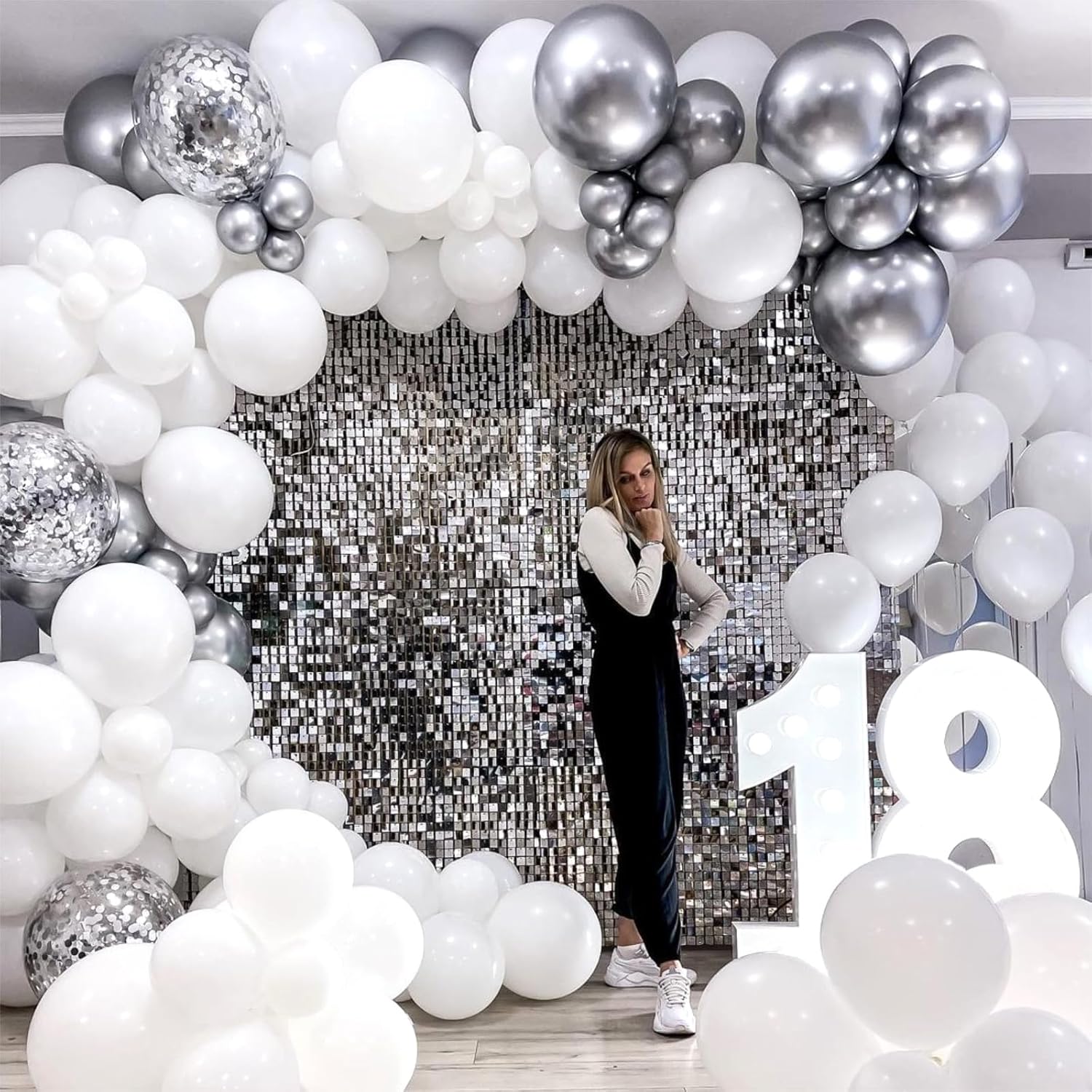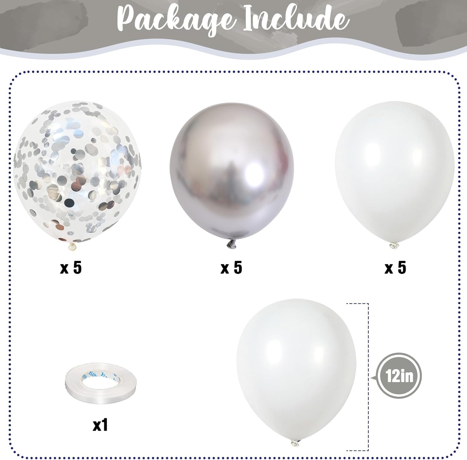- 🎉 Silver White Balloons - You will get 35 pieces 12 inch latex party balloons set, includes white 15pcs, metallic silver 10pcs, silver confetti 10pcs, come with 1pc silver balloon ribbon. Perfect for women men birthday baby bridal shower wedding new year party decorations supplies.
