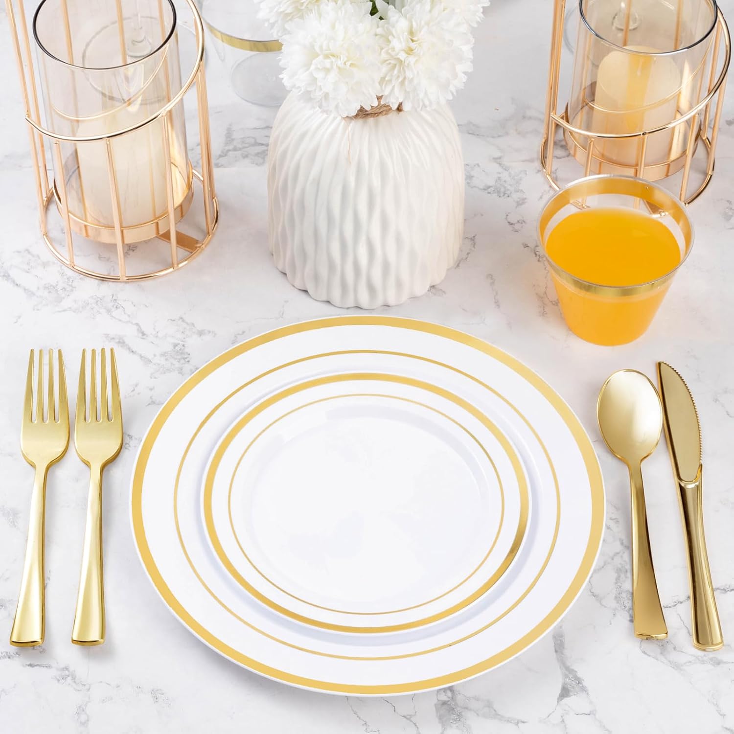 600PCS Gold Plastic Plate Set (100 Guests), Plastic Plates for Party Wedding Birthday, Disposable Dinnerware Set of 200 Plates, 200 Forks, 100 Spoons, 100 Knives for Christmas, Thanksgiving