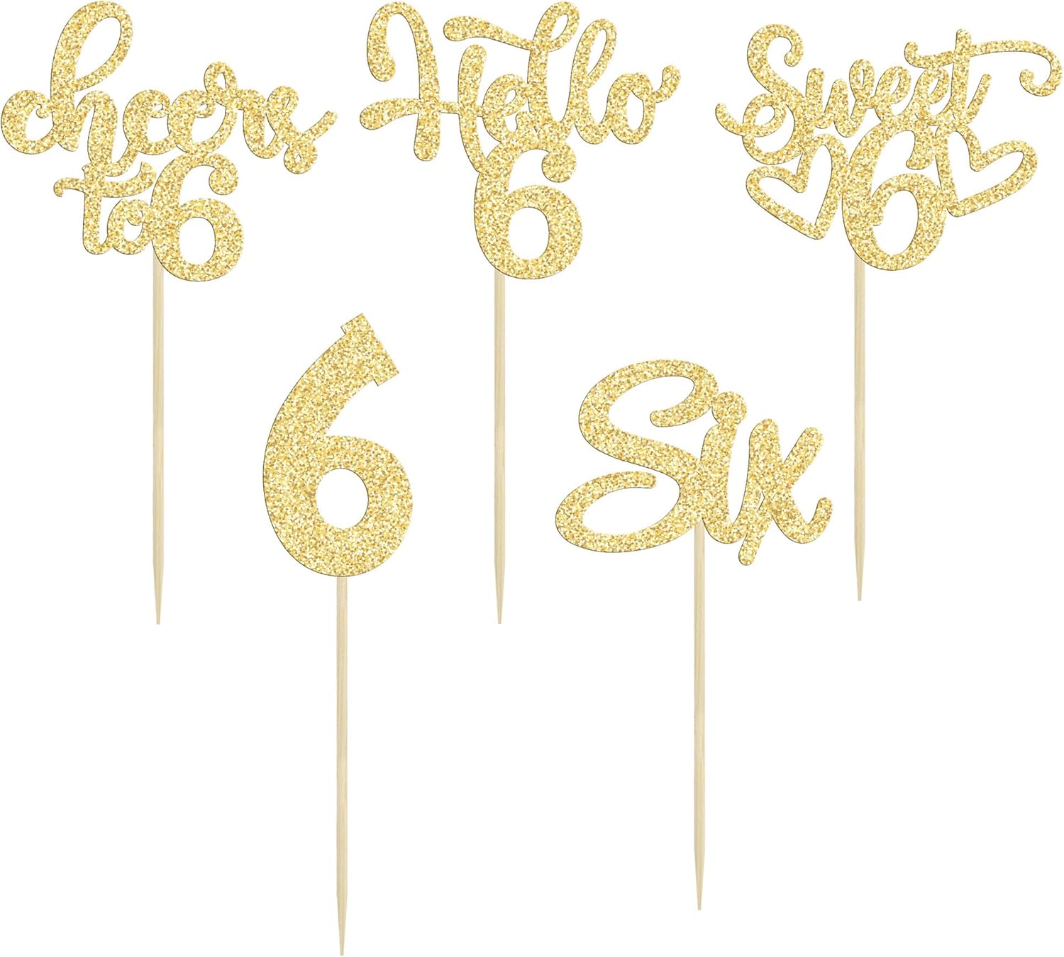 30Pcs 6th Birthday Cupcake Toppers Glitter Six Hello 6 Cupcake Picks Cheers to 6 Years Old Cake Decorations for 6th Birthday Party Supplies Gold