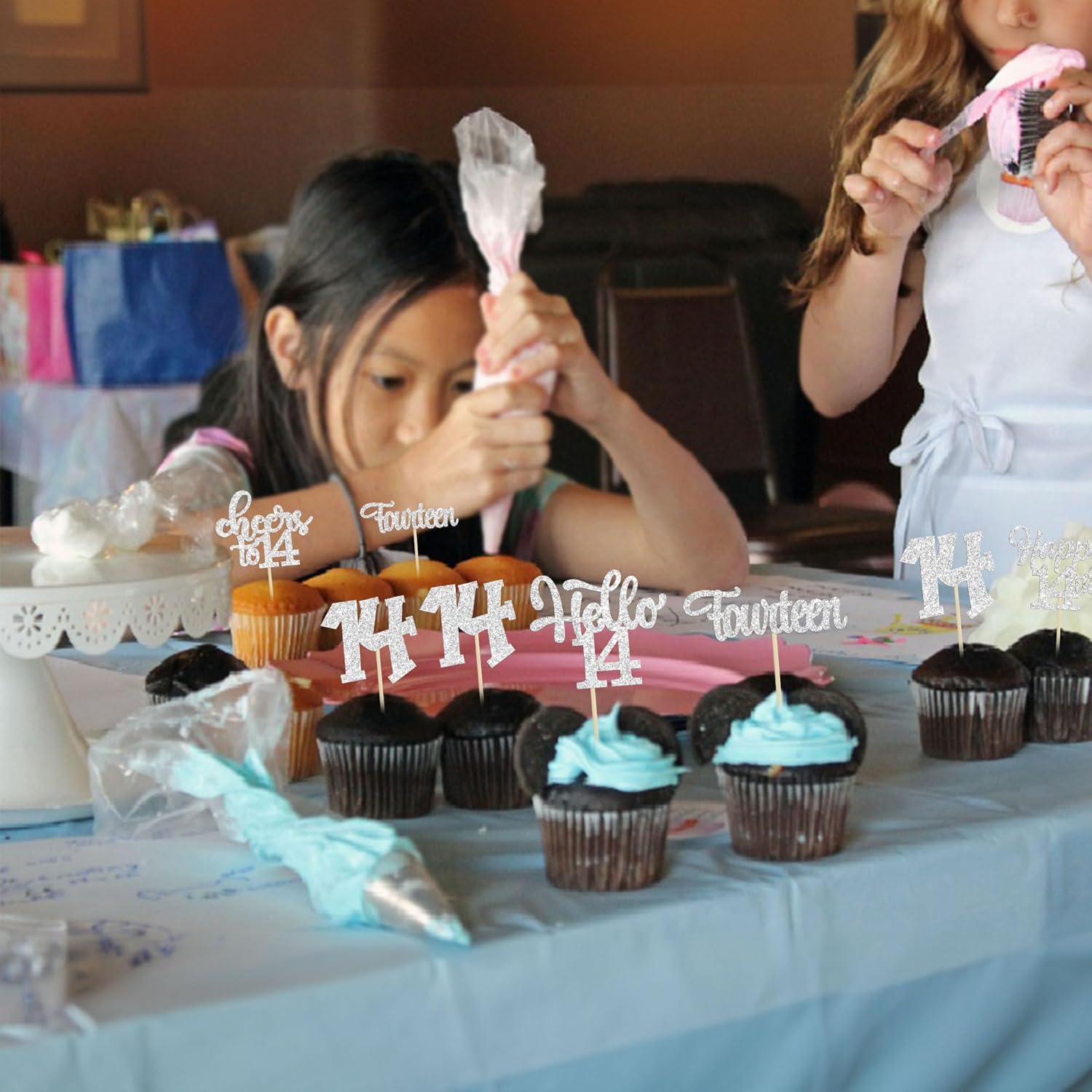 30Pcs 14th Birthday Cupcake Toppers Hello 14 Cupcake Picks Fourteen Cheers to 14 Years Old Cake Decorations for 14th Birthday Anniversary Party Supplies Silver Glitter