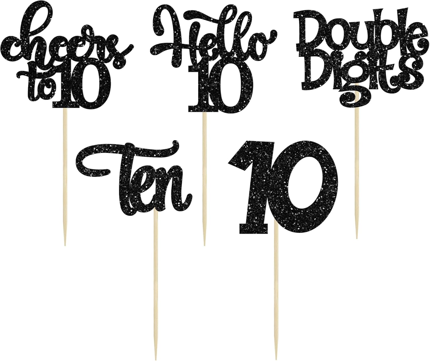 30Pcs 10th Birthday Cupcake Toppers Ten Double Hello 10 Cupcake Picks Cheers to 10 Years Old Cake Decorations for 10th Birthday Party Supplies Black Glitter