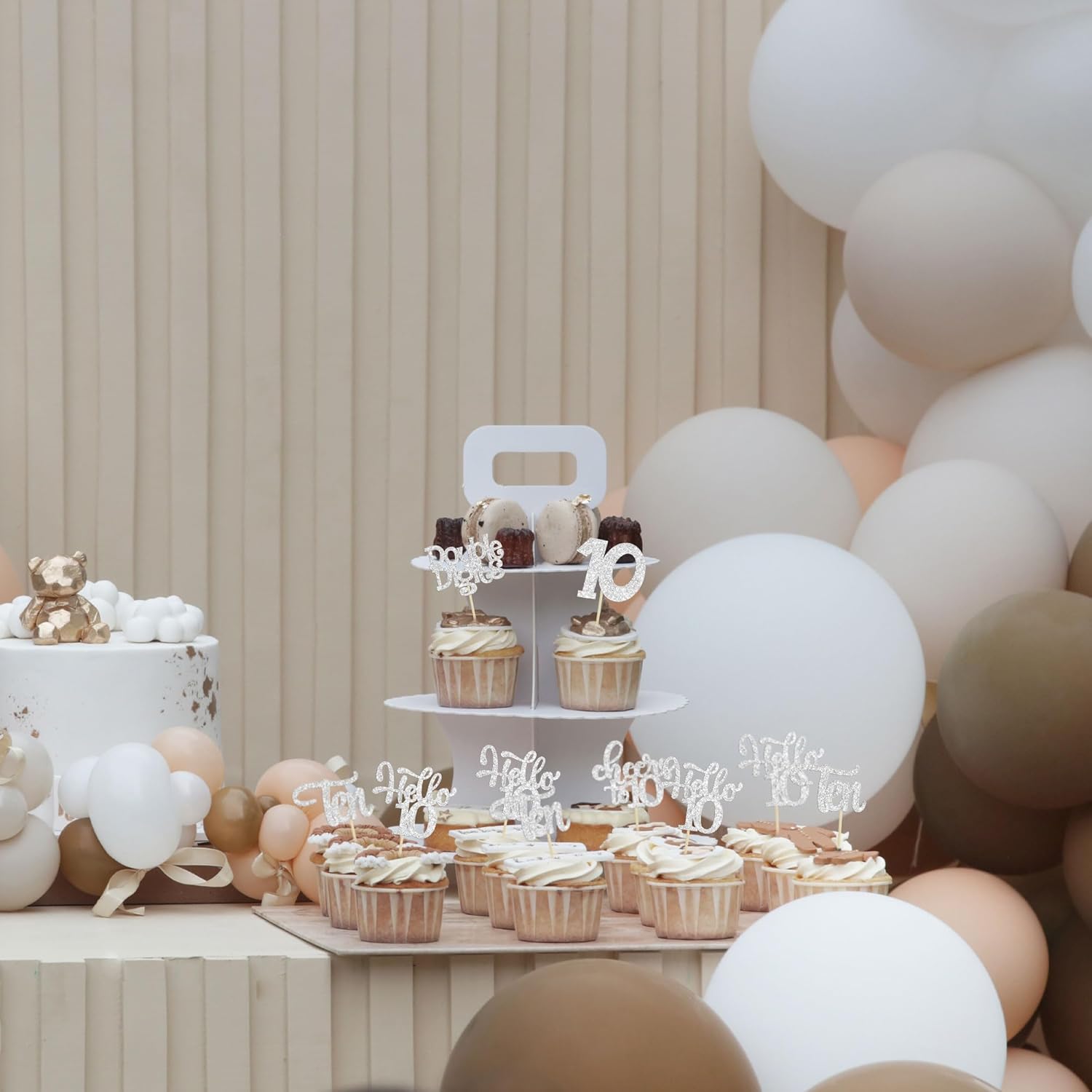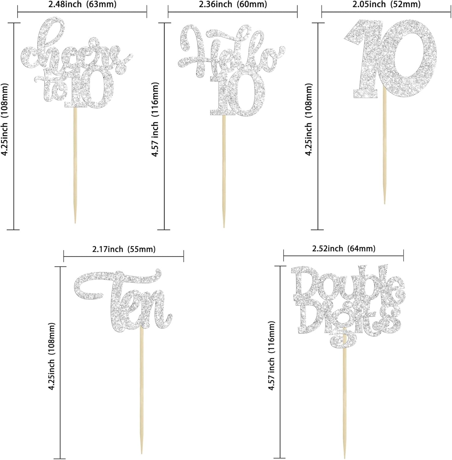 30Pcs 10th Birthday Cupcake Toppers Ten Double Hello 10 Cupcake Picks Cheers to 10 Years Old Cake Decorations for 10th Birthday Party Supplies Silver Glitter