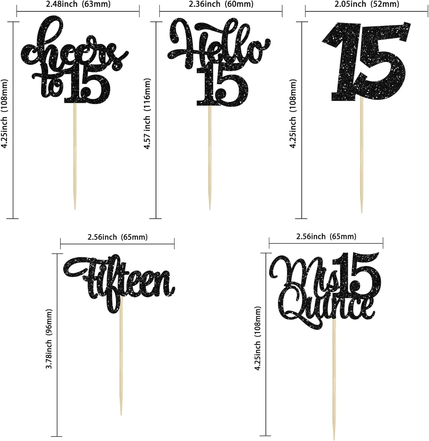 30Pcs 15th Birthday Cupcake Toppers Fifteen Cupcake Picks Cheers to 15 Years Old Mis Quince 15 Cake Decorations for 15th Birthday Anniversary Party Black Glitter