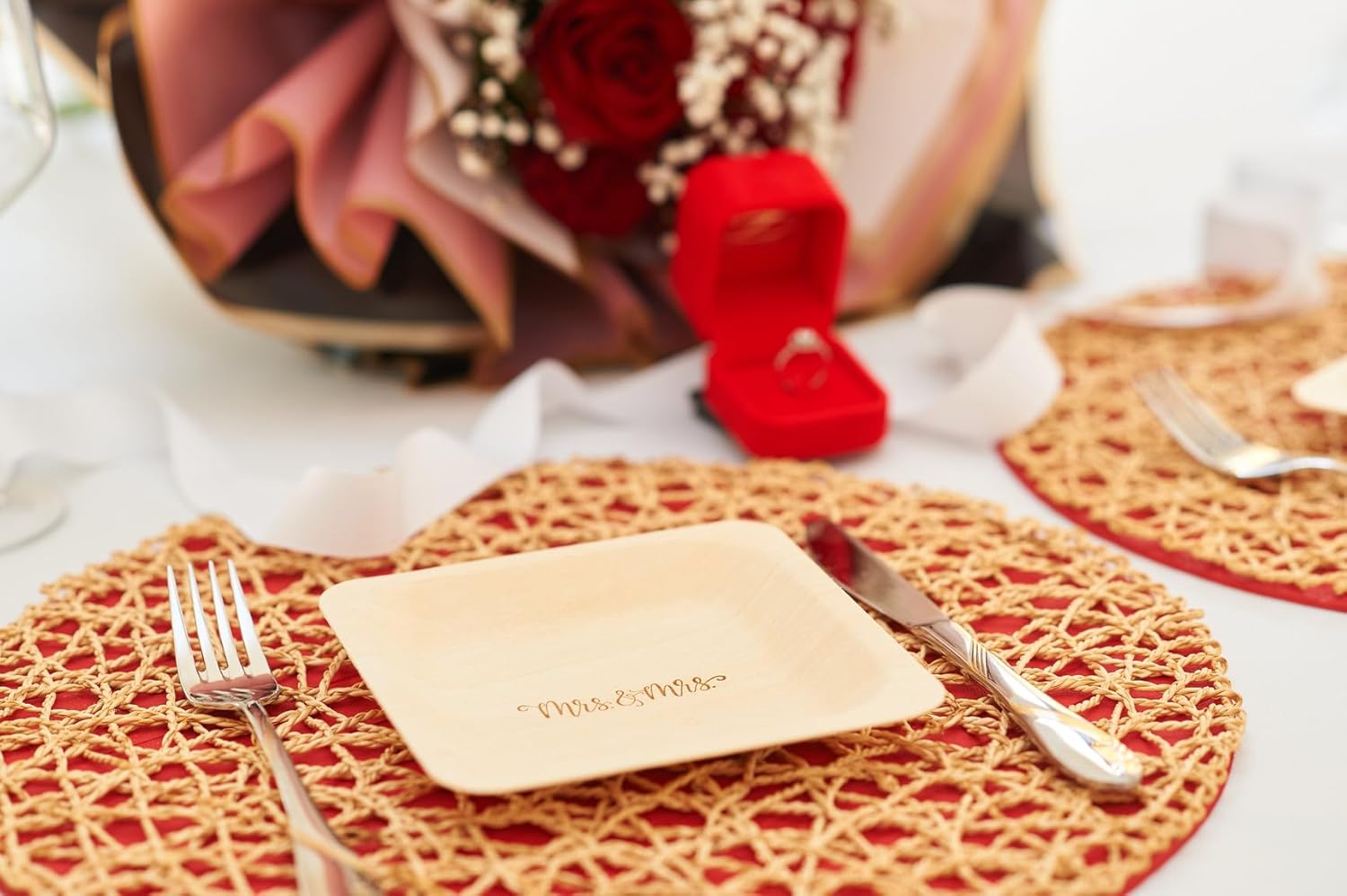 Mrs. and Mrs. Disposable Wedding Plates – Rustic, Compostable Alternative to Plastic Plates for Wedding Receptions, Engagement Parties, and Rehearsal Dinners (Appetizer, 50-Pack)