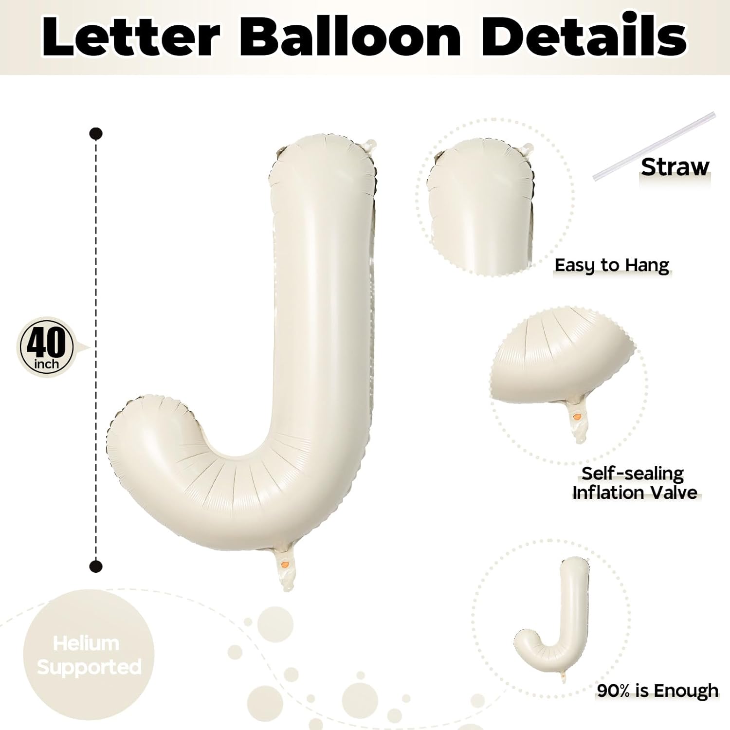 - 🎈 What You Get: Our product package includes 1pcs 40 inch "J" letter foil cream white balloon and 1pcs convenient straw for inflate. You can choose any big letter balloons to combine and customize the word you want to form. Make your party more unique and meaningful.