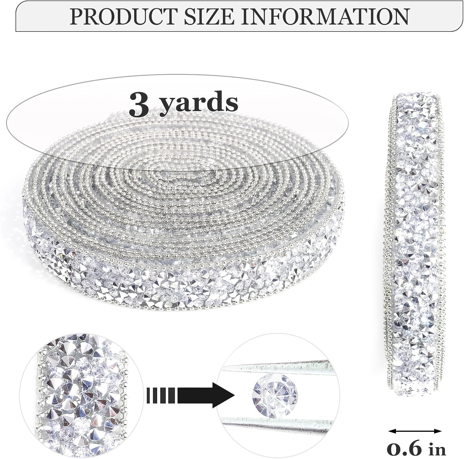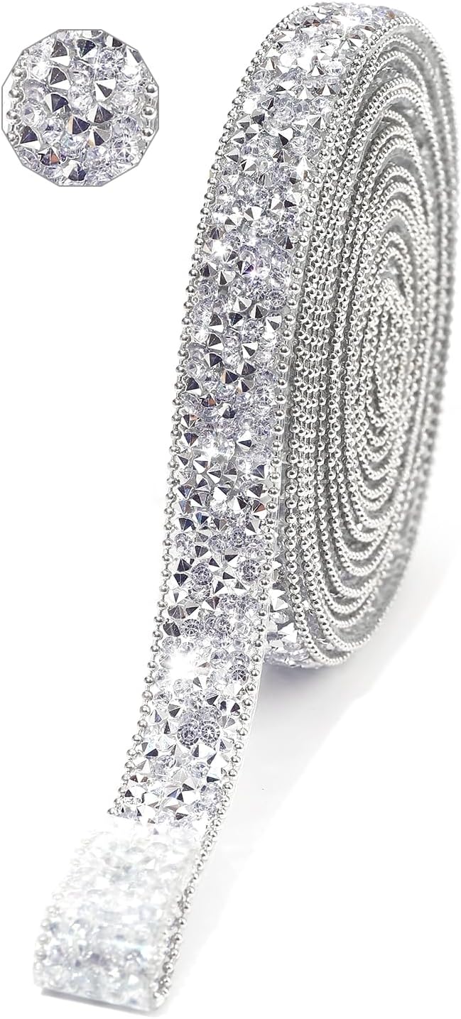 - Silver Rhinestone Ribbon: 1 roll of self-adhesive rhinestone ribbon Sticker, approx 3 yards in length, 1.5cm/0.6inch in width. (PACKAGE CONTENT)
