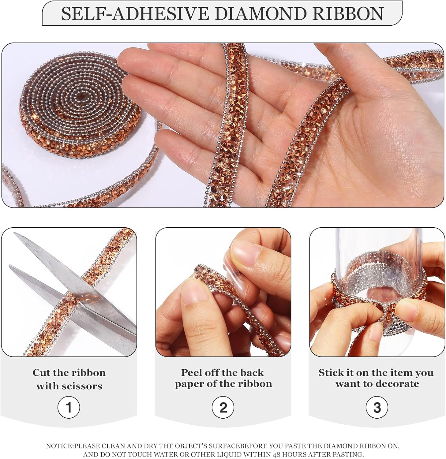 - NOTICE: 1. Please clean and dry the object's surface before you paste the diamond ribbon on, and do not touch water or other liquid within 48 hours after pasting,2. Please open this outside and air them out for a while! because the odor from production is trapped in shipping. Please give it time to let the smell go.