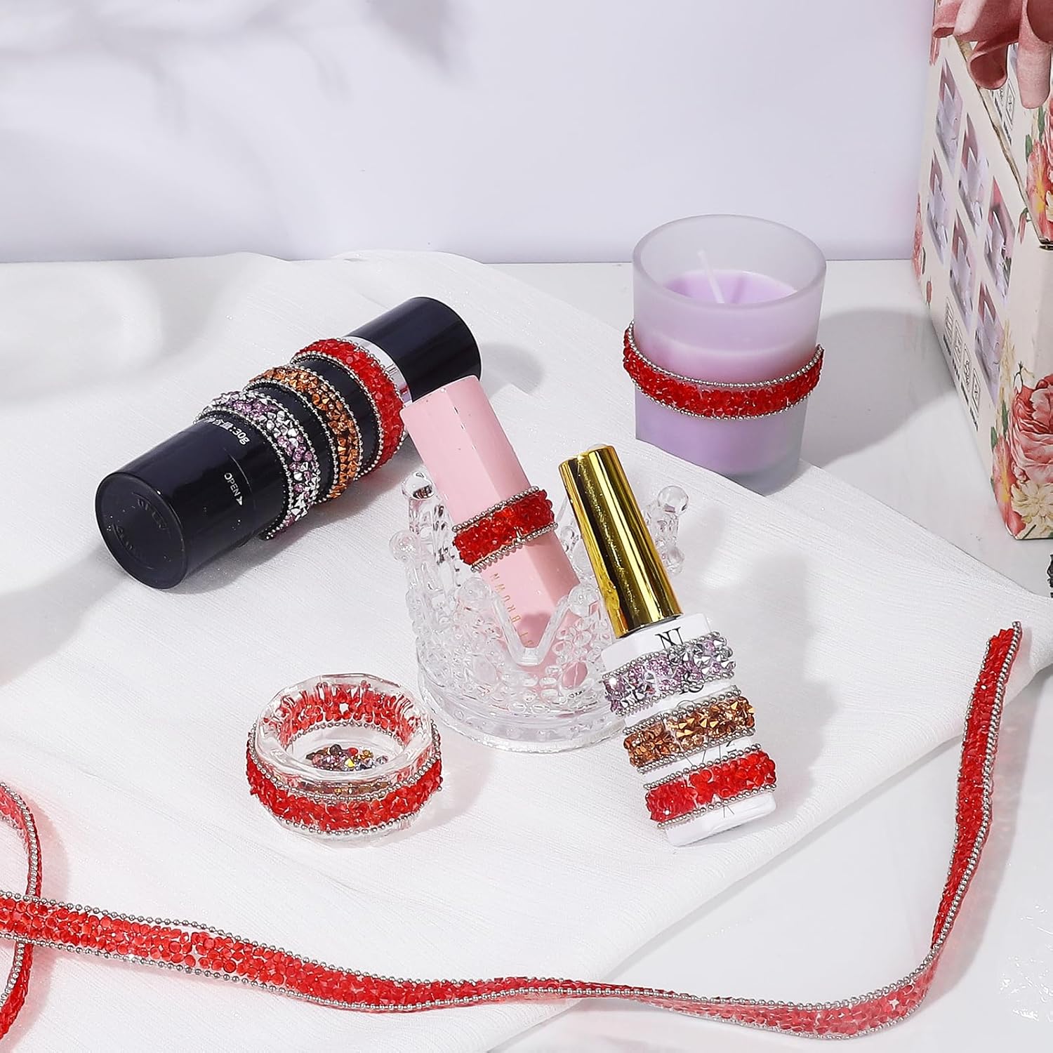 - Red Rhinestone Ribbon: 1 roll of self-adhesive rhinestone ribbon Sticker, approx 3 yards in length, 1cm/0.4inch in width. (PACKAGE CONTENT)