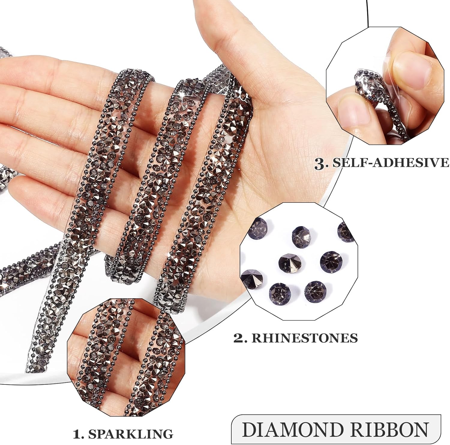 - Black Rhinestone Ribbon: 1 roll of self-adhesive rhinestone ribbon Sticker, approx 3 yards in length, 1cm/0.4inch in width. (PACKAGE CONTENT)
