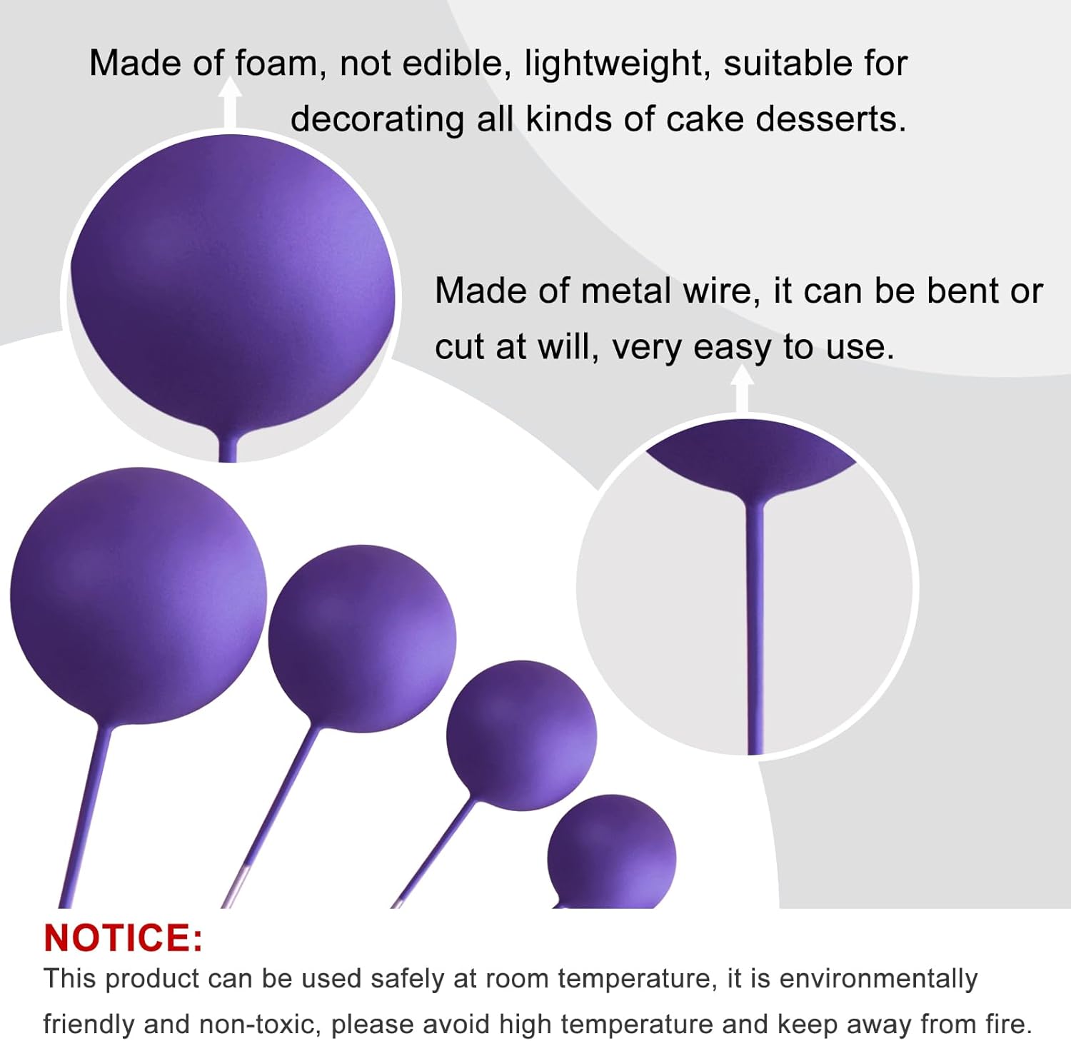 - Material: these ball decorations for cake are made of foam and wire. Safe to decorate food at room temperature, such as cake and dessert decorating use, or cupcakes, fruits, cheese and any dish and appetizer you want to decorate.