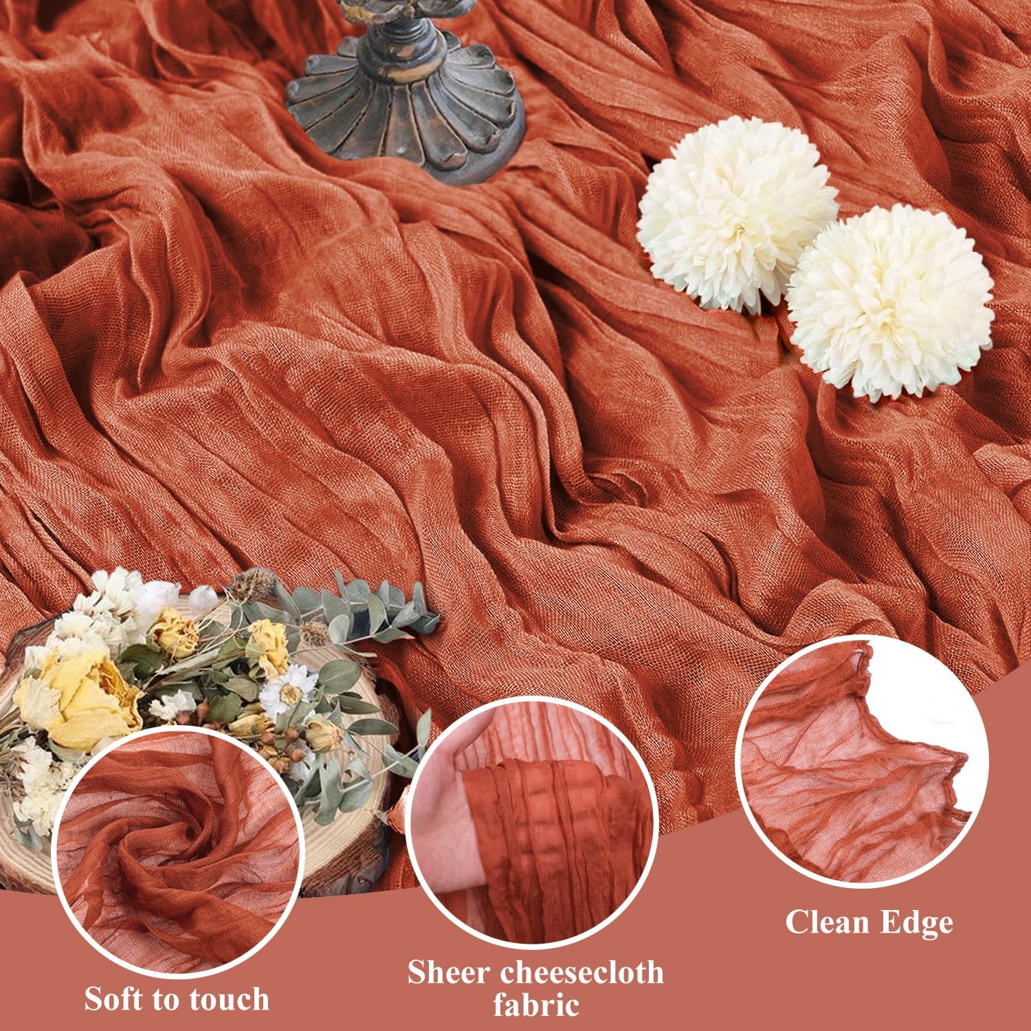 Asee'm Cheesecloth Table Runner 120 Inches Long Terracotta Boho Gauze Cheese Cloth Runner 10FT Rustic Sheer Fall Table Runners for Thanksgiving Christmas Wedding Party Baby Shower Decoration