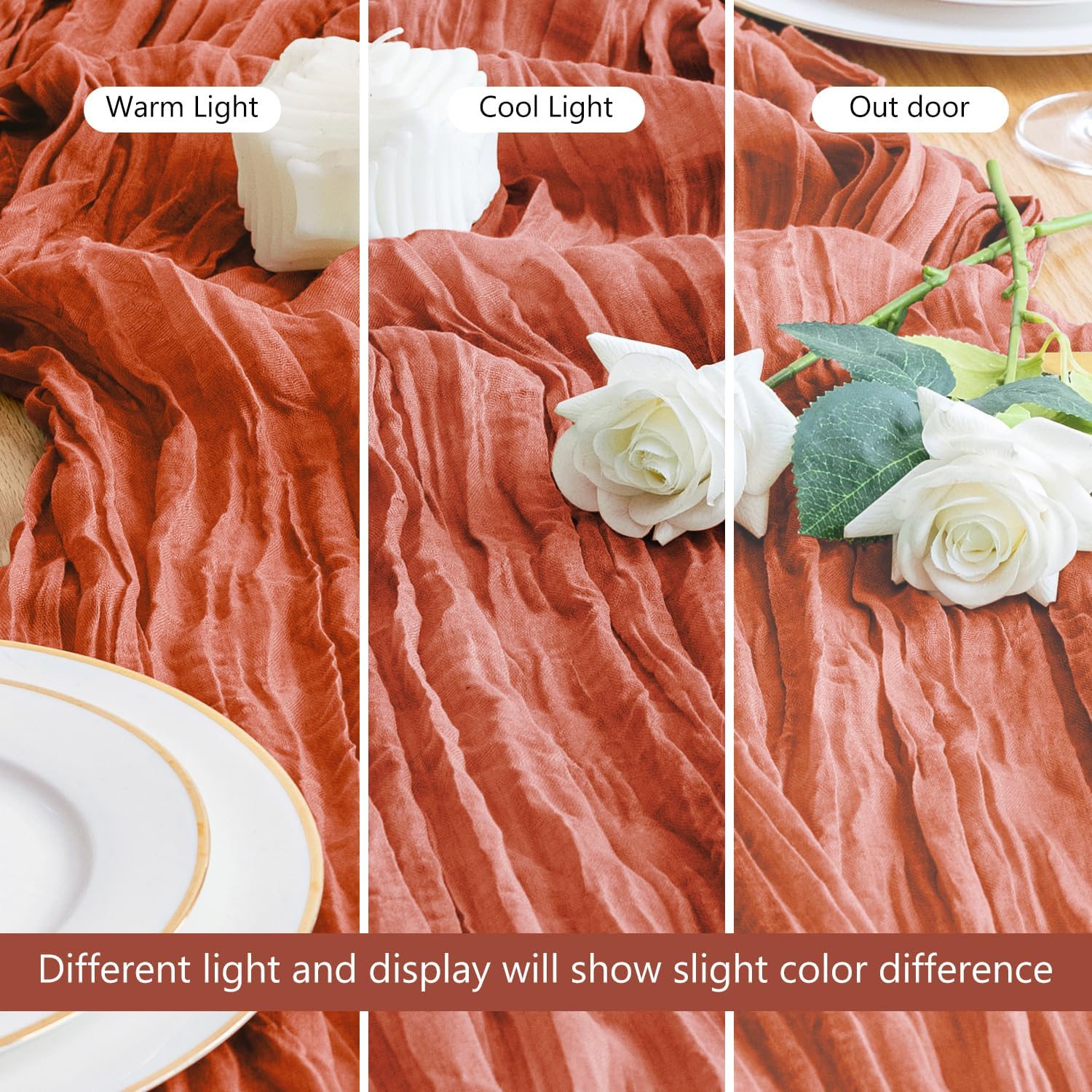 - 【Cheesecloth Table Runner】 Size: 35" W x 120" L. You will get 1 piece 10FT length cheesecloth table runner. The sheer rustic table runner is long enough to span a large table and drape gracefully across the table. It will gently sway in the wind, adding a romantic atmosphere to your occasion. These eye-catching gauze table runners are ideal for arranging an elegant, stylish tablescape.