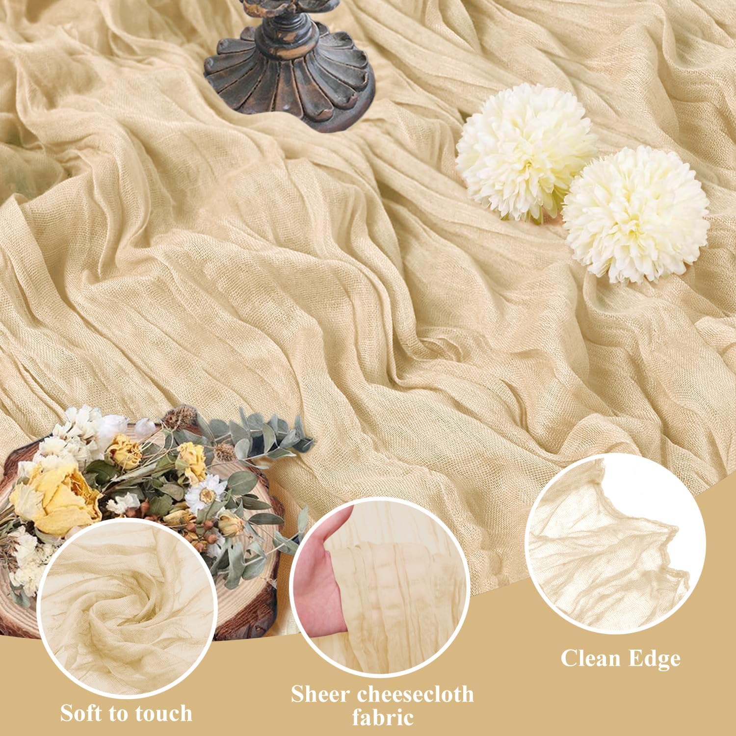 - 【Cheesecloth Table Runner】 Size: 35" W x 120" L. You will get 3 pieces 10FT length cheesecloth table runner. The sheer rustic table runner is long enough to span a large table and drape gracefully across the table. It will gently sway in the wind, adding a romantic atmosphere to your occasion. These eye-catching gauze table runners are ideal for arranging an elegant, stylish tablescape.