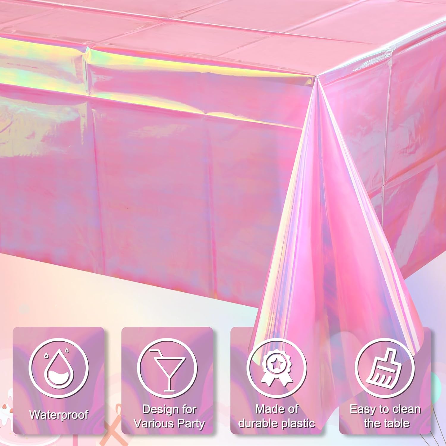 - Shimmery Laser Tablecloth: The iridescent disposable tablecloth for parties features a shiny holographic design, and it shows different color effects under different light, all very beautiful and shiny, which will be a highlight of your party and make the party atmosphere more joyful.