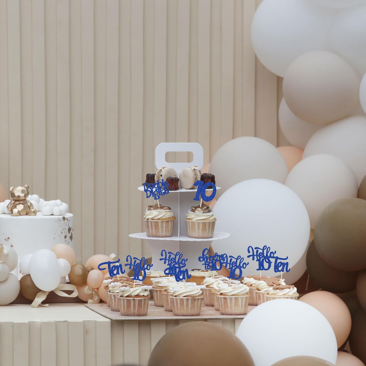 30Pcs 10th Birthday Cupcake Toppers Ten Double Hello 10 Cupcake Picks Cheers to 10 Years Old Cake Decorations for 10th Birthday Party Supplies Deep Blue Glitter