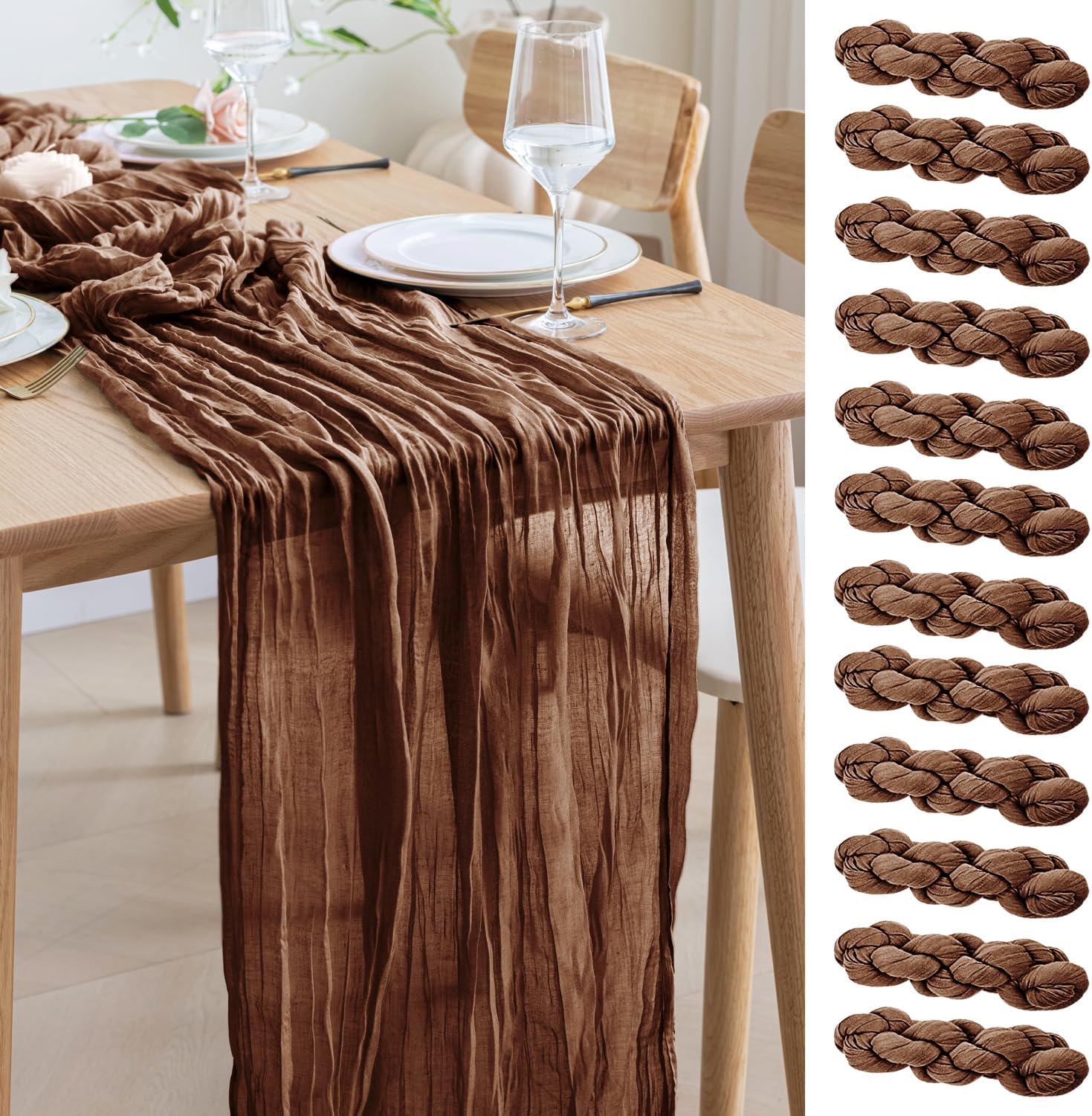 Asee'm 12pcs Cheesecloth Table Runner 120 Inches Long Brown Boho Gauze Cheese Cloth Runner 10FT Rustic Sheer Fall Table Runners for Thanksgiving Christmas Wedding Party Baby Shower Decoration