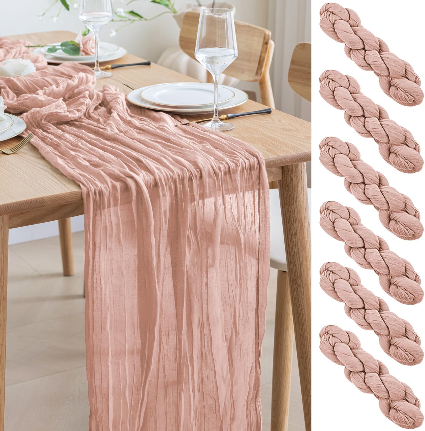 Asee'm 6PCS Table Runner Cheesecloth 10FT Dusty Pink Boho Gauze Fabric Rustic Sheer Cheese Cloth Runners for Wedding Bridal Shower Party