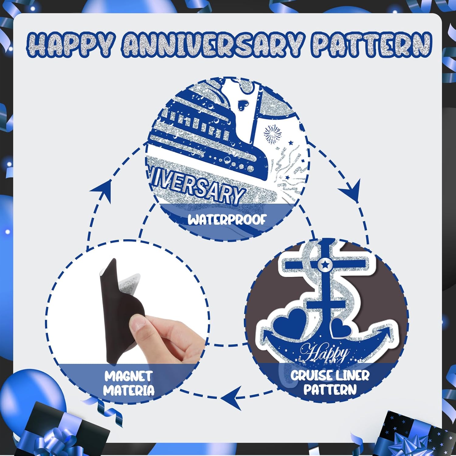 - 💌Cruise Door Magnets Decorations:You will get 16pcs of Blue Silver Happy Anniversary Cruise Door Magnets.These Happy Anniversary Cruise Door Magnets have "Happy Anniversary Cruise" and many shapes.With these beautiful happy anniversary magnets decorations, they further set off a atmosphere of your anniversary party.