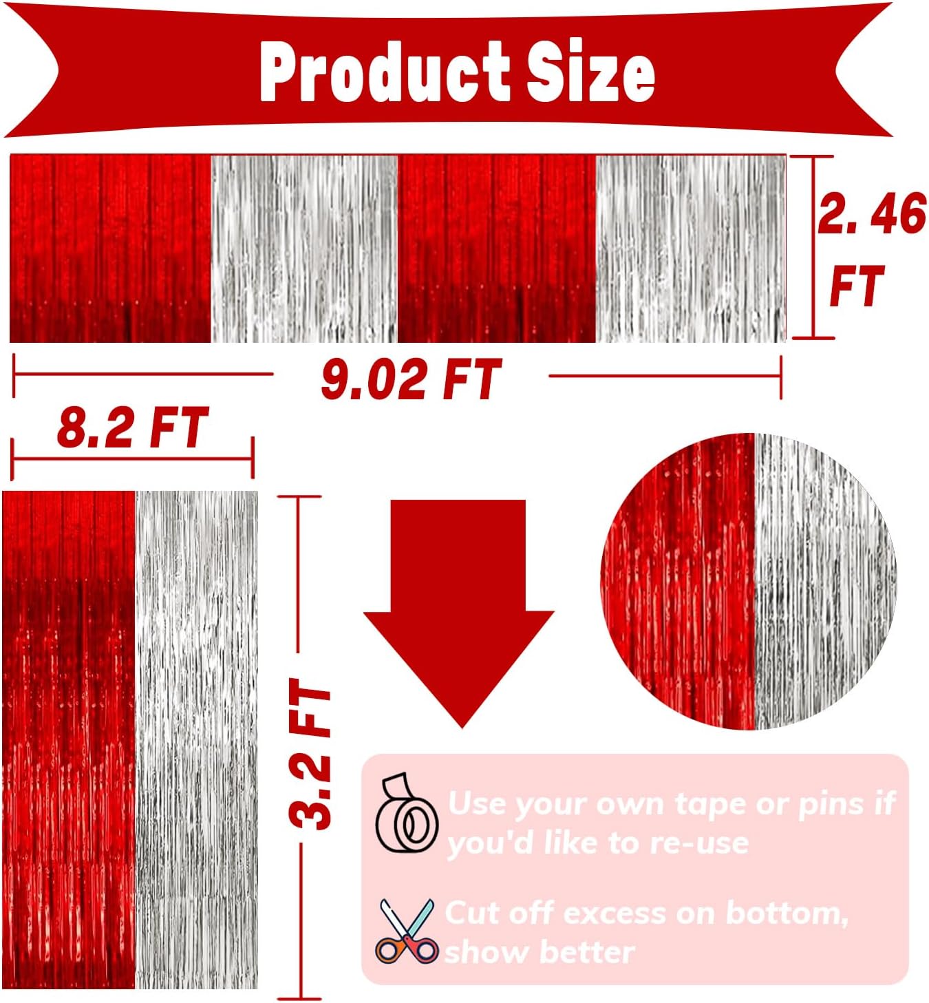 - Material: Plastic 2 Pack Party Streamers: 3.2ft x 8.2ft(W*L) 2 Pack Foil Fringe Tinsel Table Skirt: 30inx 108in(W*L) Please confirm the size you need before buying. Peel off the sticker on the back and stick it on the door you want to decorate, the size fit for any party backdrop, which can create an impressive decorative effect.