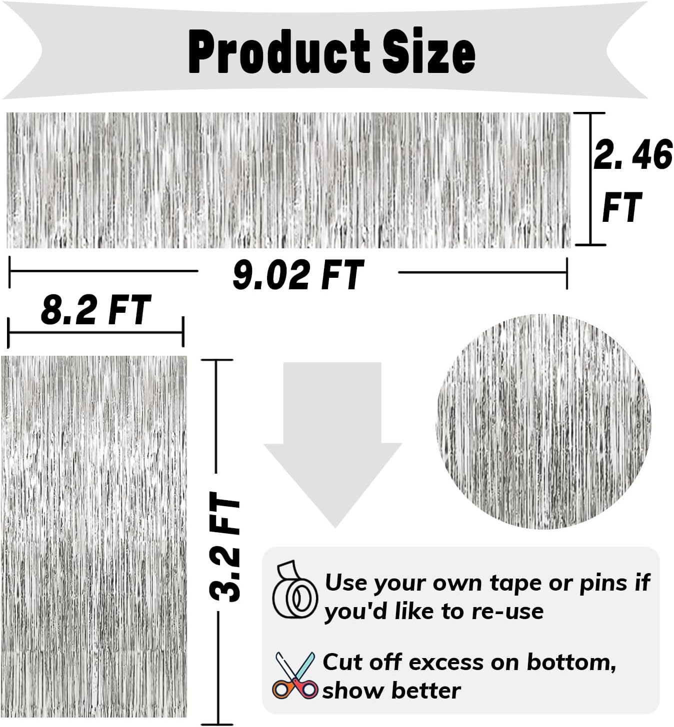 - Material: Plastic 2 Pack Party Streamers: 3.2ft x 8.2ft(W*L) 2 Pack Foil Fringe Tinsel Table Skirt: 30inx 108in(W*L) Please confirm the size you need before buying. Peel off the sticker on the back and stick it on the door you want to decorate, the size fit for any party backdrop, which can create an impressive decorative effect.