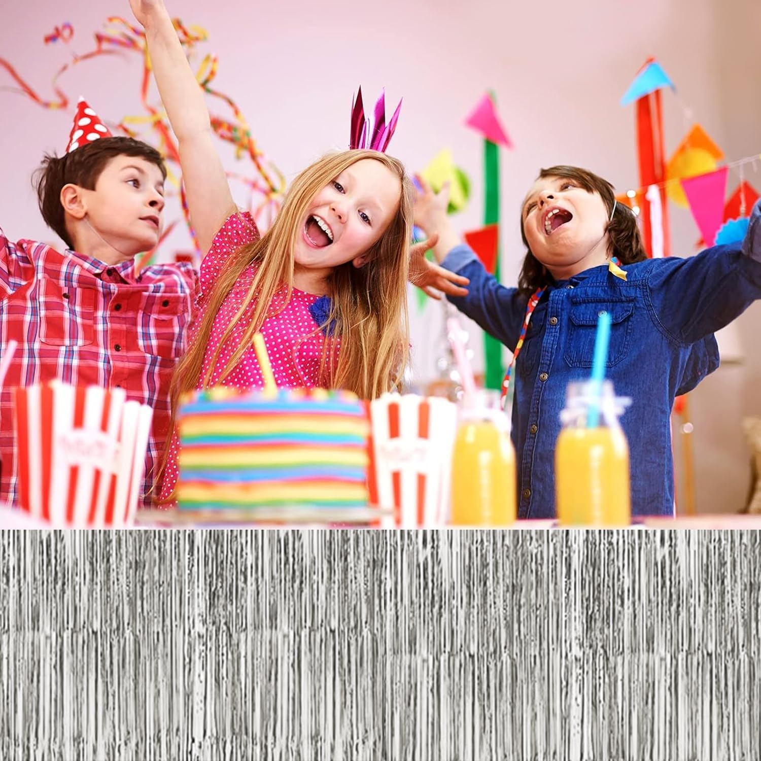 4P Metallic Foil Fringe Tinsel Table Skirts for Rectangle Tables Backdrop Banner Tinsel Streamer Garland Curtains for Parade Floats Wedding Graduation Anniversary Birthday Parties Decoration (Silver)